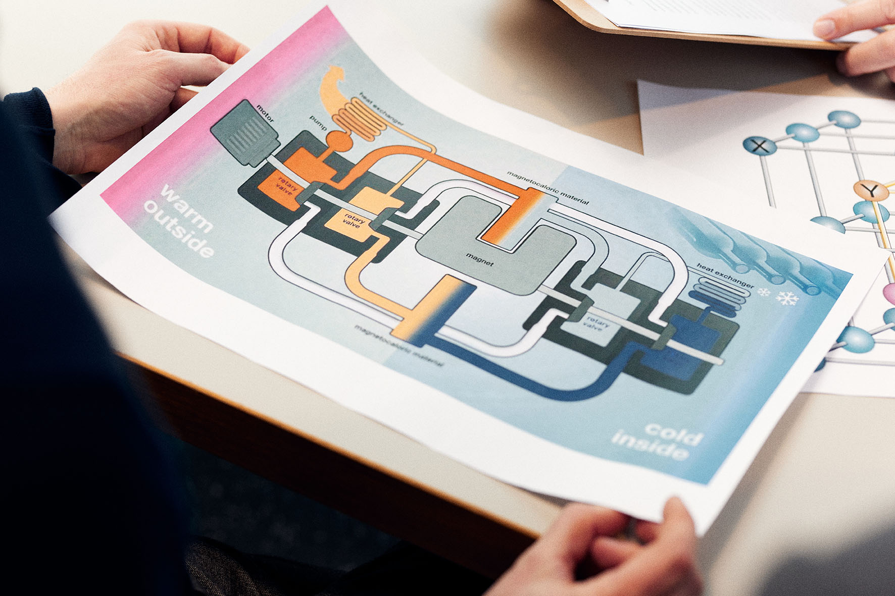 Dieser physikalische Effekt tritt bei bestimmten magnetisierbaren Materialien auf, die sich erwärmen, sobald sie auf ein magnetisches Feld treffen. Die entstandene Wärme wird an die Umgebung abgegeben, bis die Ausgangstemperatur wieder erreicht worden ist. Beim Entfernen des Feldes kühlt sich das Material dann schlagartig ab. Das Ergebnis: ein steuerbares Kühlverfahren ohne umweltschädliche Kühlmittel. Magnetokalorische Kühlsysteme besitzen dabei einen bis zu 30 Prozent höheren Wirkungsgrad als Kompressoren, kurz: Sie sparen Energie und reduzieren den CO2-Ausstoß.