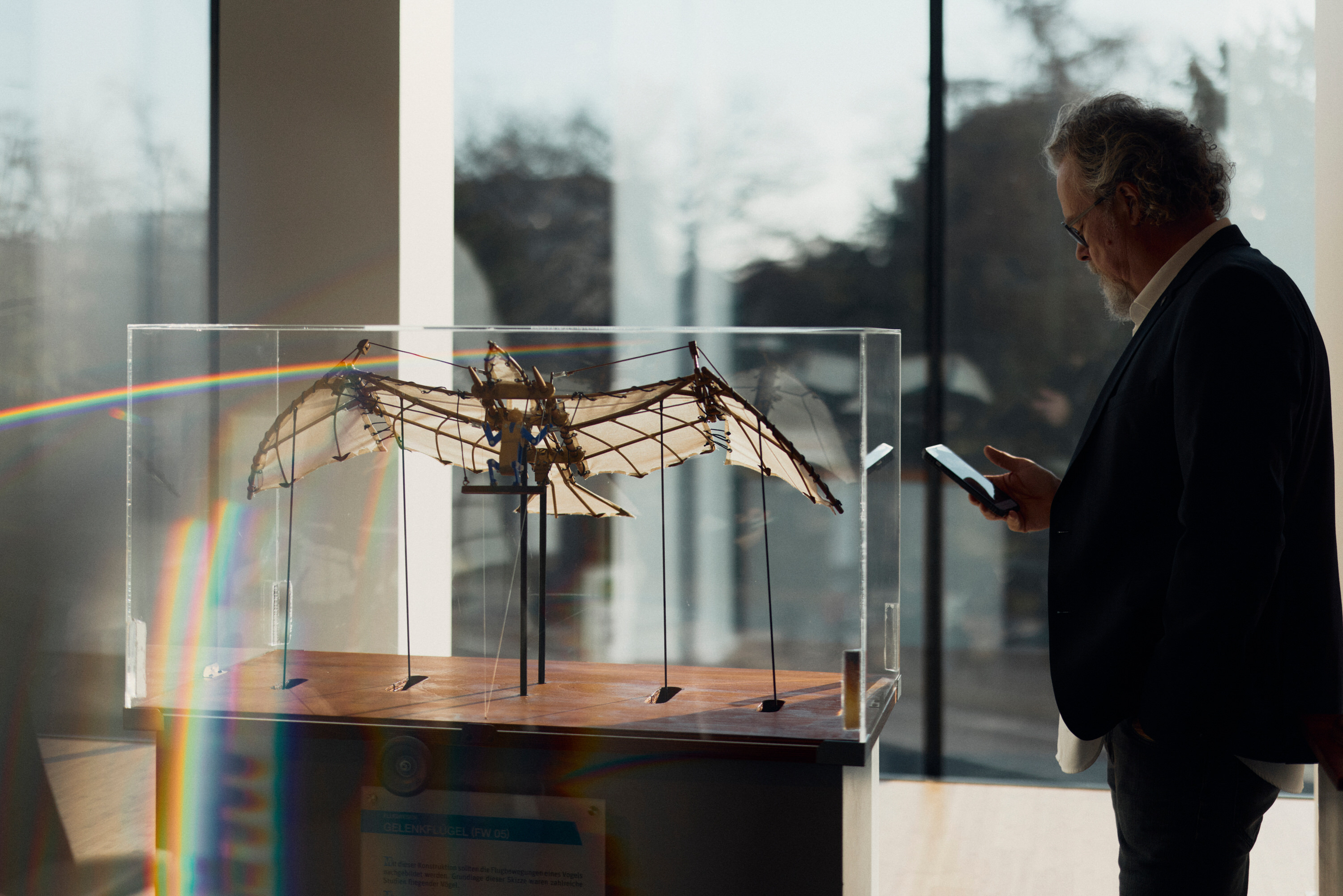 Neben Flügeln und Flug-Equipment wie Wind- oder Strömungsmesser sind in der neuen Dauerausstellung auch Modelle von Leonardos Gleiter, dem Gelenkflügel, dem Fallschirm und der Luftschraube zu sehen. Anfassen und ausprobieren ist dabei ausdrücklich erlaubt. „Unser Motto ist begreifen durch begreifen“, unterstreicht Marc-Oliver Schierenberg. Bewegt man einen hölzernen Hebel – vorsichtig, schlägt ein Flügel sanft auf und ab. „Jetzt mit Schwung!“, ruft Andreas Wollensak und schlägt den Hebel ein paar mal kräftig nach unten. „Sonst spürt man den Luftwiderstand ja nicht“, erklärt er mit einem nachsichtigen Grinsen. „Wie bei einem Regenschirm, den man ganz schnell schließt.“ Und wenn das Modell dabei kaputt geht? Schierenberg bleibt gelassen. „Dann reparieren wir es.“