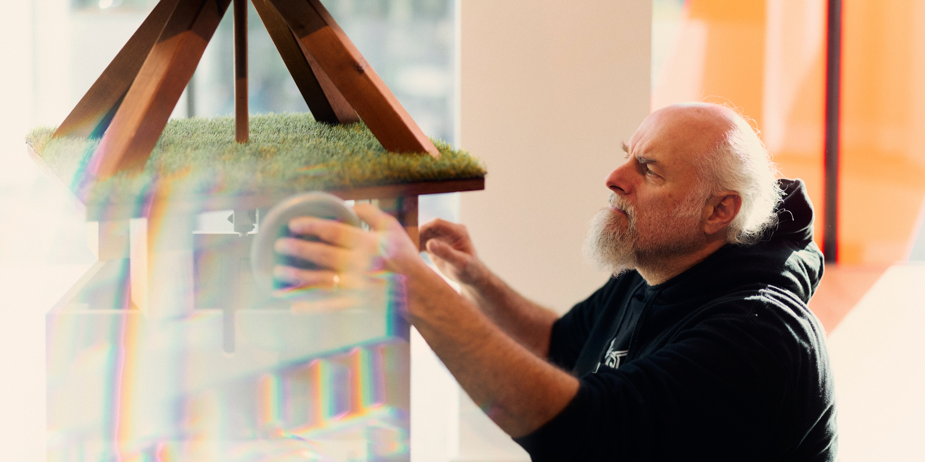 Im Keller der „Wissenswerkstadt“ hat das Projekt DaVinci@HSBI eine eigene Werkstatt, in der Objekte ausgebessert oder mit Studierenden zusammengebaut werden können. Der Fokus liegt aktuell allerdings weniger auf der Erstellung neuer Modelle. „Wir arbeiten derzeit vor allem am digitalen Hintergrund unserer Exponate“, sagt Schierenberg und scannt mit seinem Handy einen QR-Code an der Flügelschlag-Maschine. Auf dem Display erscheint ein dreidimensionales Abbild des Modells. „Entweder man schaut sich das einzelne Objekt von allen Seiten mit all seinen Funktionen und Informationen an oder“ – Schierenberg wechselt in den Augmented-Reality-Modus – „man bewegt und platziert es frei hier in der Ausstellung.“ Und lässt sich selbst zusammen mit dem digitalen Objekt fotografieren oder filmt es in Aktion. „So kann man ein Stück der Ausstellung mit nach Hause nehmen.“