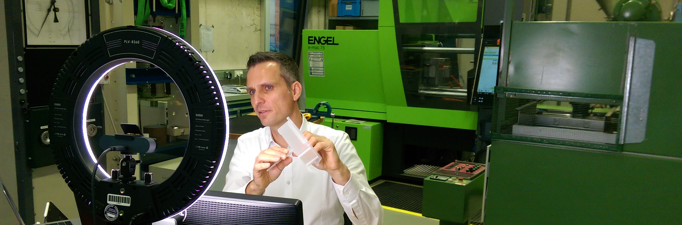 Minden (fhb). Die Maschinen brummen, ein angenehmer Geruch von Kunststoff liegt in der Luft. Prof. Dr.-Ing. Daniel Paßmann sitzt vor seinem Computer. Über seinen Bildschirm ragt eine Webcam, für die perfekte Ausleuchtung ist sie an einem Stativ inklusive Ringlicht befestigt. Paßmann befindet sich im Maschinenlabor für Kunststoffverarbeitung am Campus Minden der Fachhochschule (FH) Bielefeld. Per Videokonferenz-Tool ist er mit den Studierenden seines Kunststoffverarbeitungskurses verbunden. Für sie streamt er live aus der Maschinenhalle.