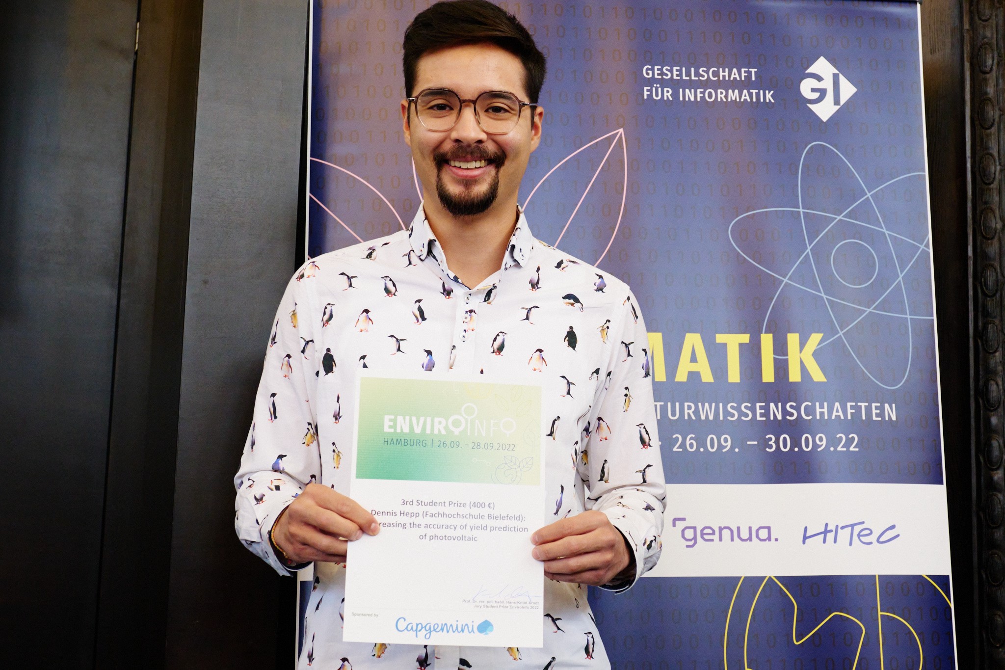 Bielefeld/Minden/Gütersloh (fhb). Für seine Arbeit über den Umgang mit Schnee auf Photovoltaikmodulen wurde Dennis Hepp, der an der Fachhochschule (FH) Bielefeld Data Science studiert, anlässlich der Europäischen Umweltinformatikkonferenz EnviroInfo mit dem Preis für Umweltinformatik ausgezeichnet.
