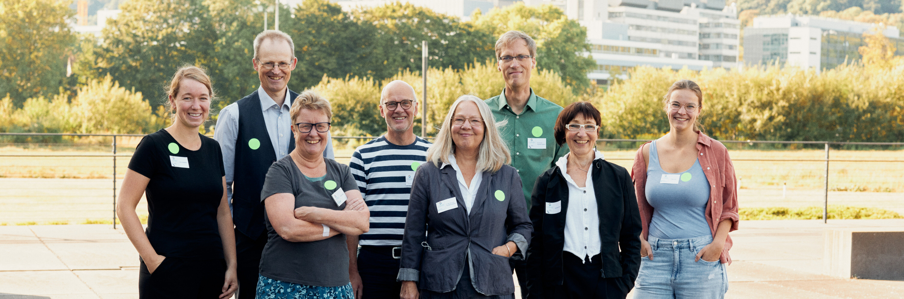 Das Planungsteam der Messe (v.l.): Anne Wohlfahrt (B.A. Soziale Arbeit, Kompetenzzentrum Selbstbestimmt Leben), Markus Schneider (Autismus OWL e.V.), Vera Trocha (Rehakoordinatorin, Fortbildungsakademie der Wirtschaft (FAW) gGmbH), Matthias Reiser-Wolke (MZEB-Medizinisches Zentrum für Erwachsene mit Behinderung, Psychologischer Psychotherapeut, Autismus-Koordinator Wittekindshof), Dr. Eva Maria Schepers (Leitung des Westf. Instituts für Entwicklungsförderung), Prof. Dr. phil. Christian Huppert (FH Bielefeld, Fachbereich Sozialwesen), Christiane Möcker (Dipl. Päd./MA, Mitarbeiterin des Planungsteams) und Clara Heil (B.A. Soziale Arbeit, Mitarbeiterin des Planungsteams).