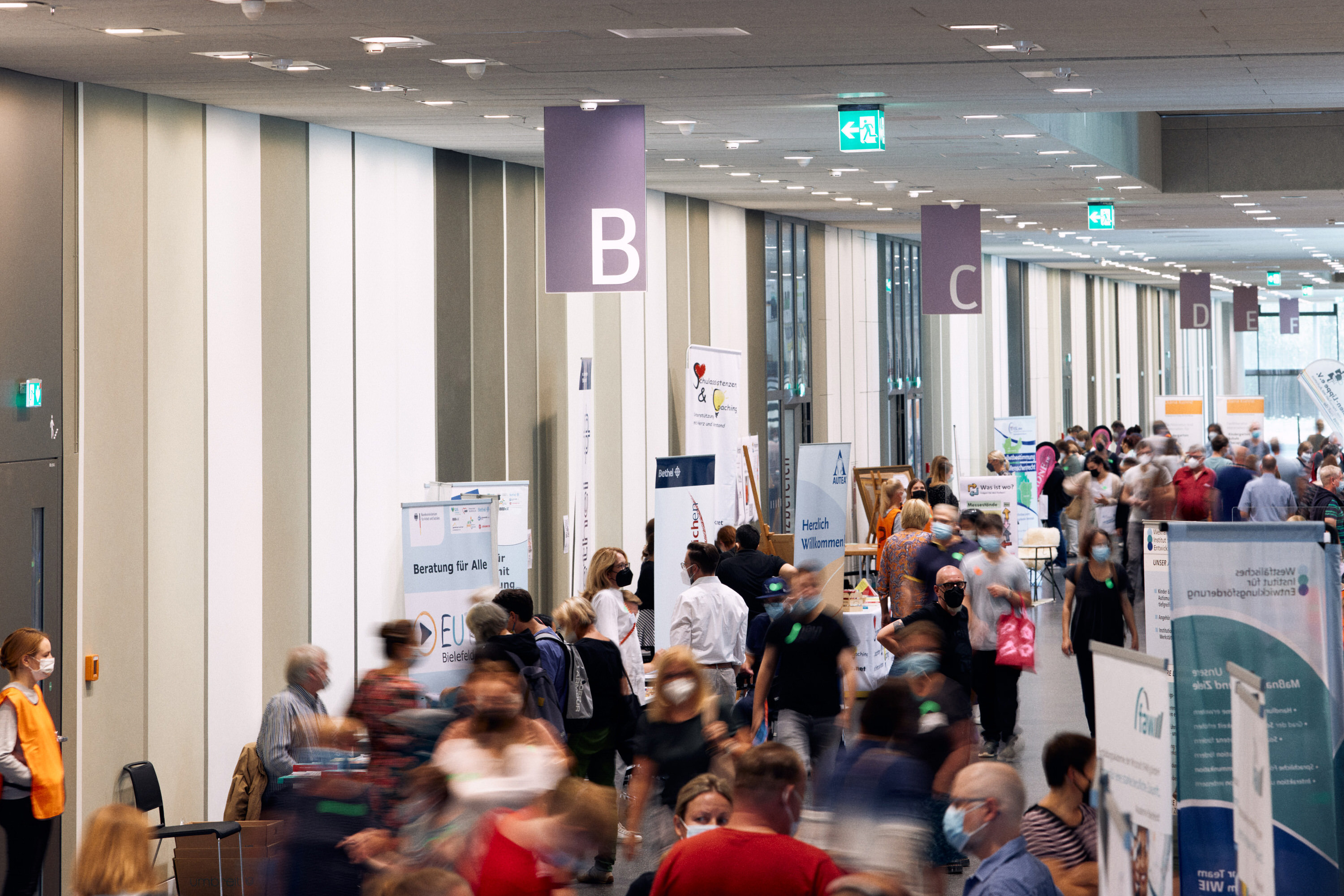 Lebendig, informativ und inspirierend: Der Messe- und Fachtag Autismus OWL bot Menschen im Autismus-Spektrum, Angehörigen, Fachpersonal sowie Wissenschaftlerinnen und Wissenschaftlern ein vielfältiges Programm. Dabei stand die Frage nach einem selbstbestimmten Leben im Zentrum des Austausches. Und so sendete der Tag an der FH immer auch die Botschaft nach außen, dass mehr mit den Menschen im Autismus-Spektrum gesprochen und geforscht werden sollte als nur über sie.Einiges los: Mehr als 1.000 Gäste besuchten den Messe- und Fachtag Autismus OWL an der FH Bielefeld.
