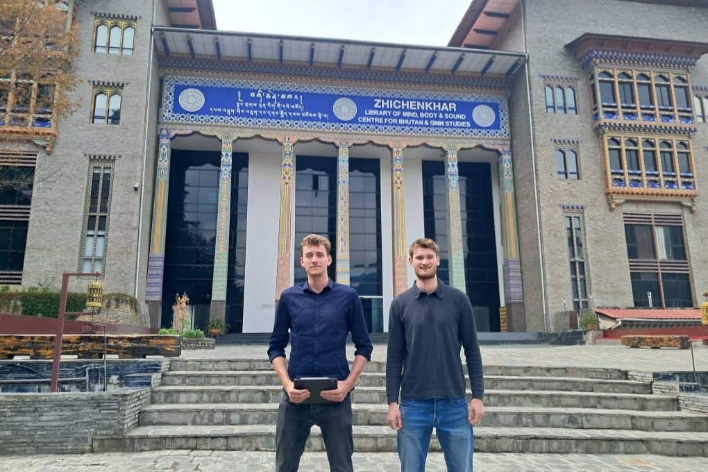 Hier befinden sich Leon Büsing und Benjamin Goltsch vor dem CBS, dem Centre for Bhutan Studies and Gross National Happiness Research.