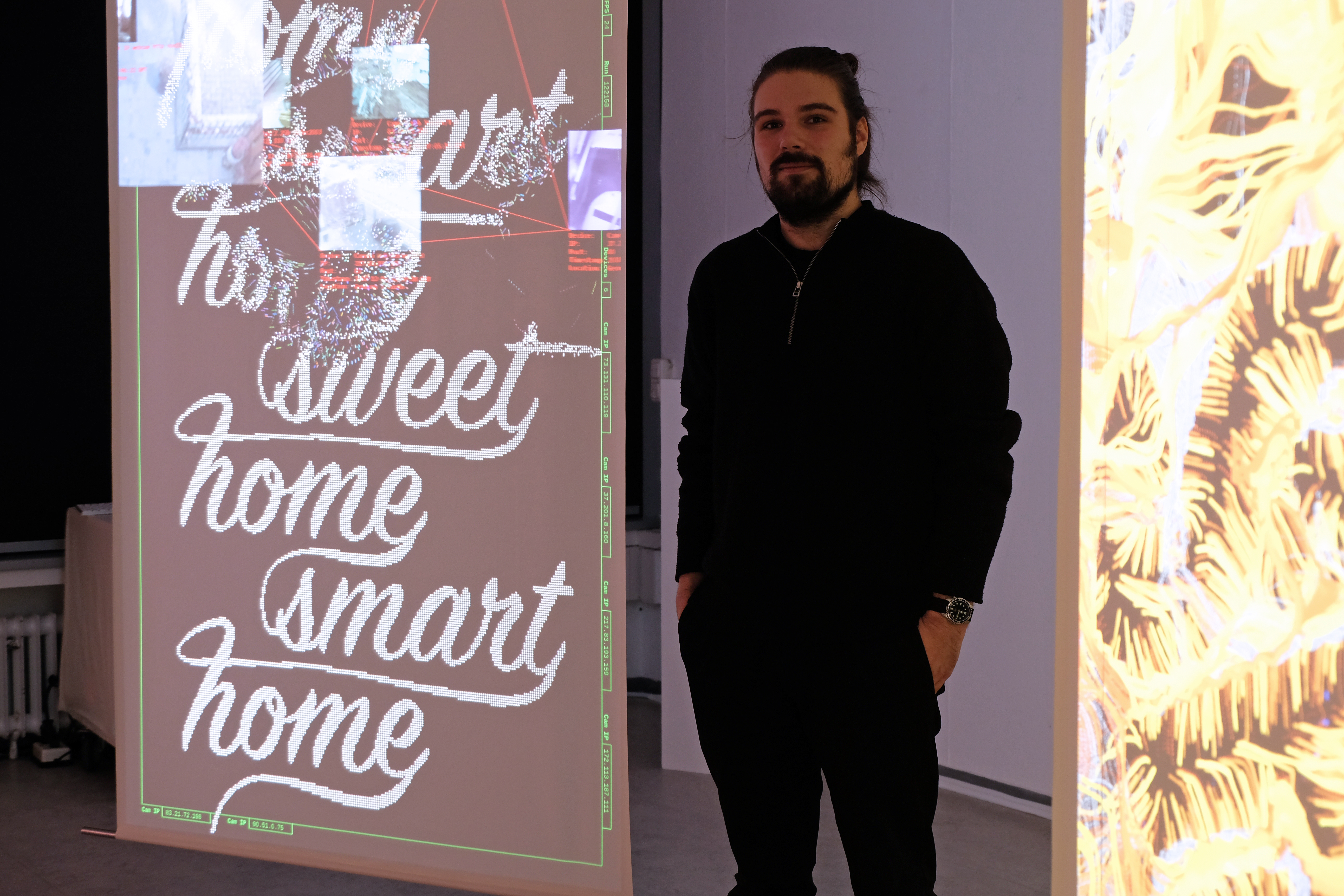 Im Ausstellungsraum von Nils Pisarsky traf der Besucher auf drei digitale und sich ständige verändernde „Poster“, die sich mit den Themen „Smart Home“ oder Klimawandel auseinandersetzen. Das Besondere ist, dass die Poster nicht programmiert worden sind, sondern sich durch einen Code selbstständig neu generieren. „Die Arbeit von Nils Pisarsky gibt einen Vorgeschmack darauf, welche Arten von Arbeiten in Zukunft verstärkt am Fachbereich zu sehen sein werden“, erklärt Prodekan Professor Dirk Fütterer und bezieht sich dabei auf die neue Studienrichtung „Digital Arts and Experiment“, die ab dem Wintersemester 2019/ 2020 erstmalig an der FH Bielefeld studiert werden kann.