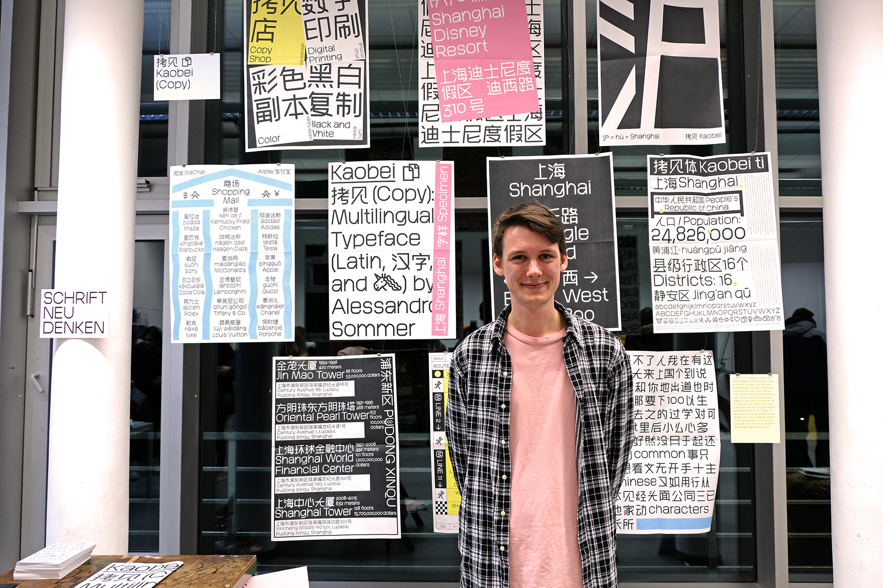 Alessandro Sommer entwickelte für sein Masterprojekt eine ganz neue Schrift, für die er sich von seinem Auslandssemester in Shanghai inspirieren ließ. „Schrift ist mehr als das reine Abbilden von Sprache“, erläutert Sommer. Seine Schrift, deren Buchstaben Einflüsse von lateinischen Buchstaben, chinesischen Schriftzeichen und auch „Emojis“ verbindet, soll eine Gleichstellung der Schriften und Annäherung der Kulturen symbolisieren.