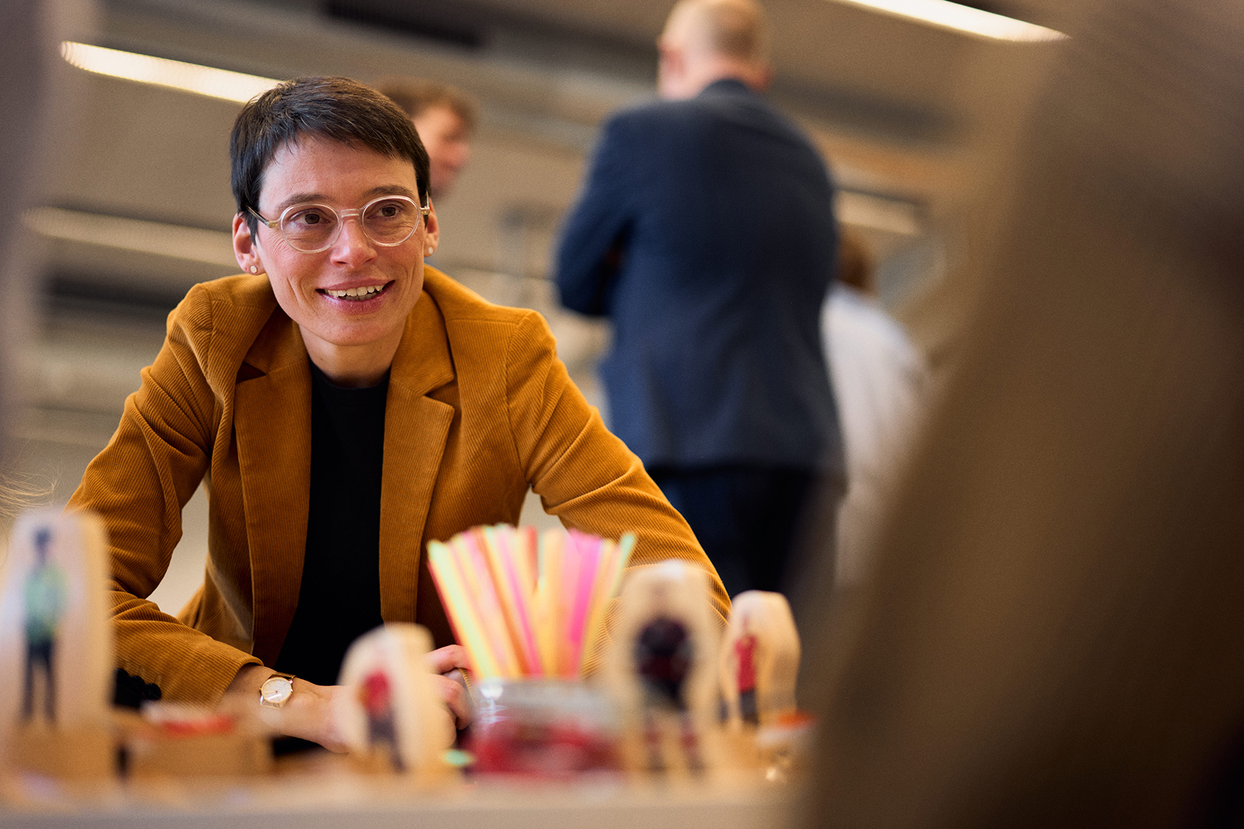 Neue Leitlinien für pädagogisches Handeln in Kindertageseinrichtungen, Kindertagespflege, Grundschule und Ganztag berücksichtigen unter anderem aktuelle gesellschaftliche Entwicklungen wie beispielsweise die wachsende Verbreitung von digitalen Medien im frühen Kindesalter und die zunehmende Bedrohung von Gemeinschaft und Demokratie. NRW-Familienministerin Josefine Paul (im Vordergrund, 2.v.l.) mit den kleinen und großen Teilnehmer:innen des Treffens in der Bildungswerkstatt der HSBI.