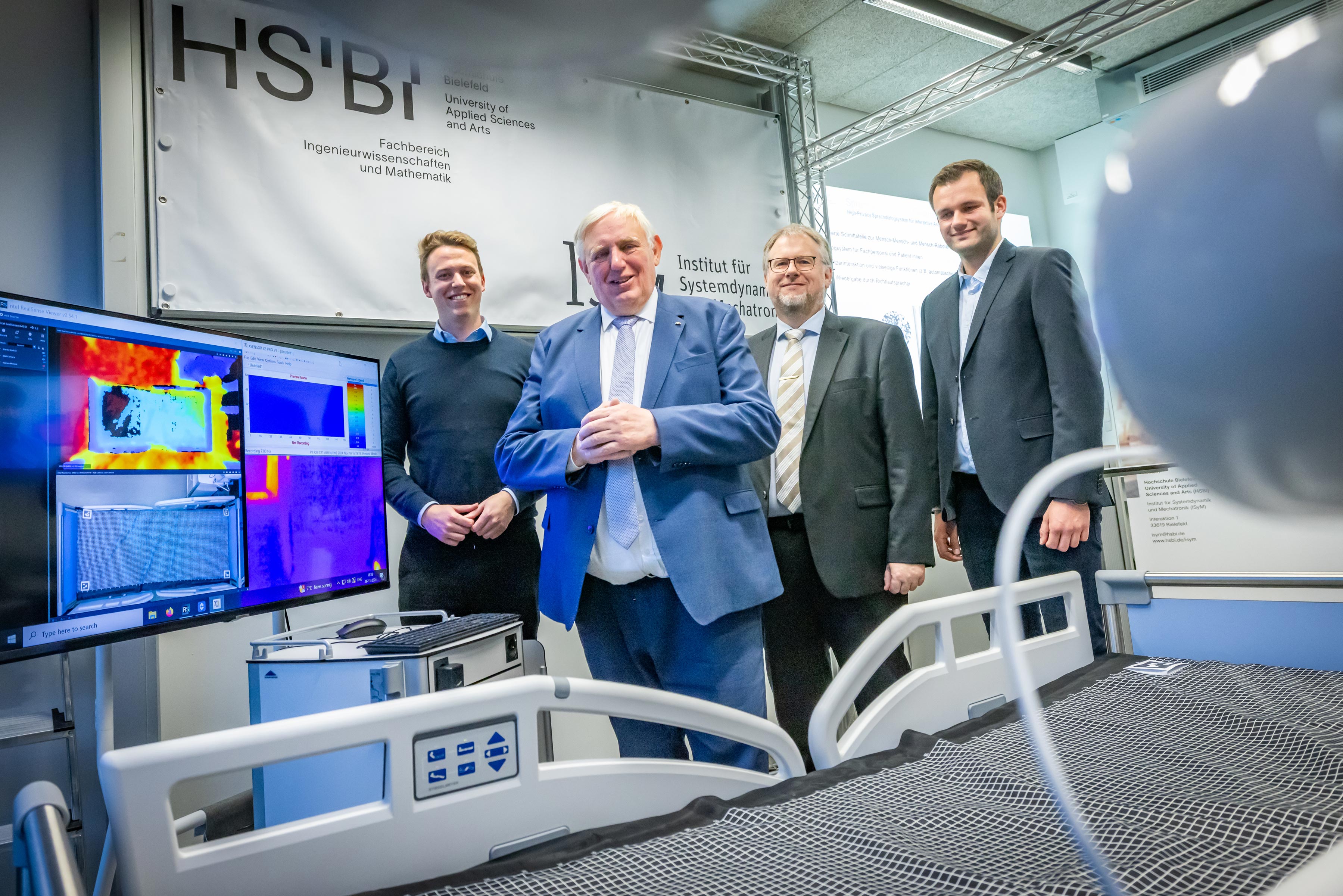 Die Herausforderungen im Gesundheitswesen sind vielfältig. Am CareTech OWL werden gemeinsam mit Praxispartnern Lösungen entwickelt, die pflegerische, medizinische, soziale und technologische Aspekte einbeziehen. Das hat sich Karl-Josef Laumann, Minister für Arbeit, Gesundheit und Soziales des Landes Nordrhein-Westfalen, am vergangenen Montag an der Hochschule Bielefeld aus der Nähe angeschaut.Zu Besuch im Labor vom CareTech OWL (v.l.): Tom Brüntrup, MdL NRW, NRW-Gesundheitsminister Karl-Josef Laumann, Prof. Dr. Axel Schneider, einer der Sprecher des CareTech OWL an der HSBI, und Philipp Jünemann, wiss. Mitarbeiter am Fachbereich Ingenieurwissenschaften und Mathematik der HSBI.