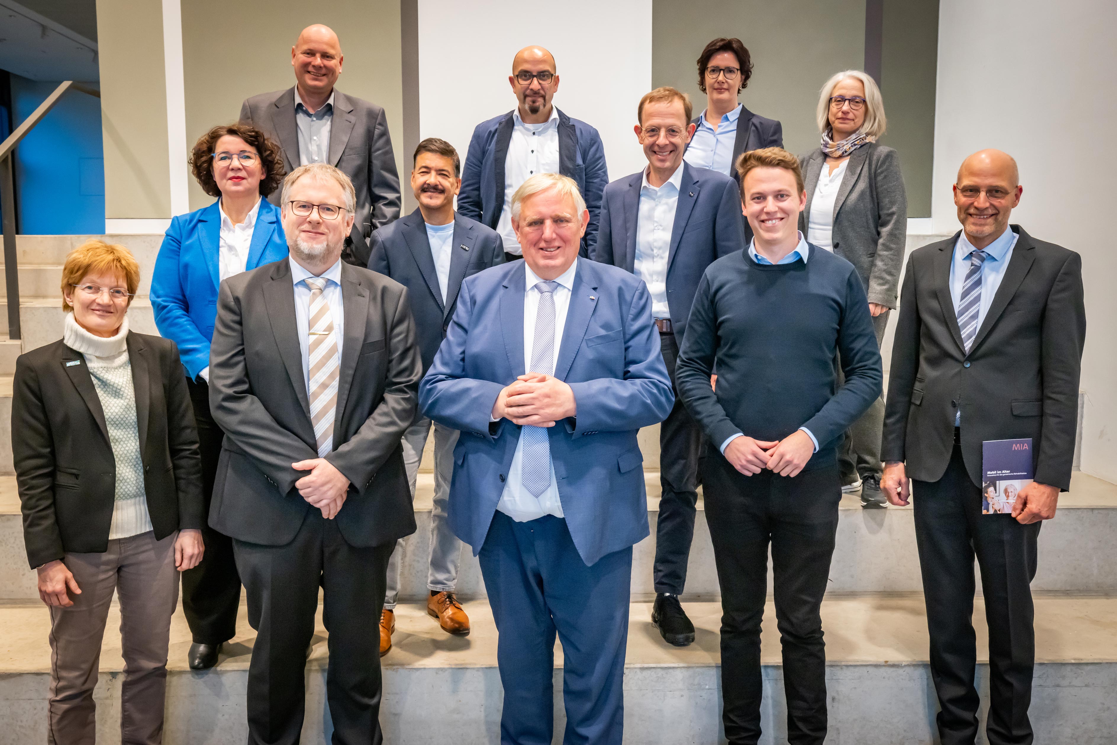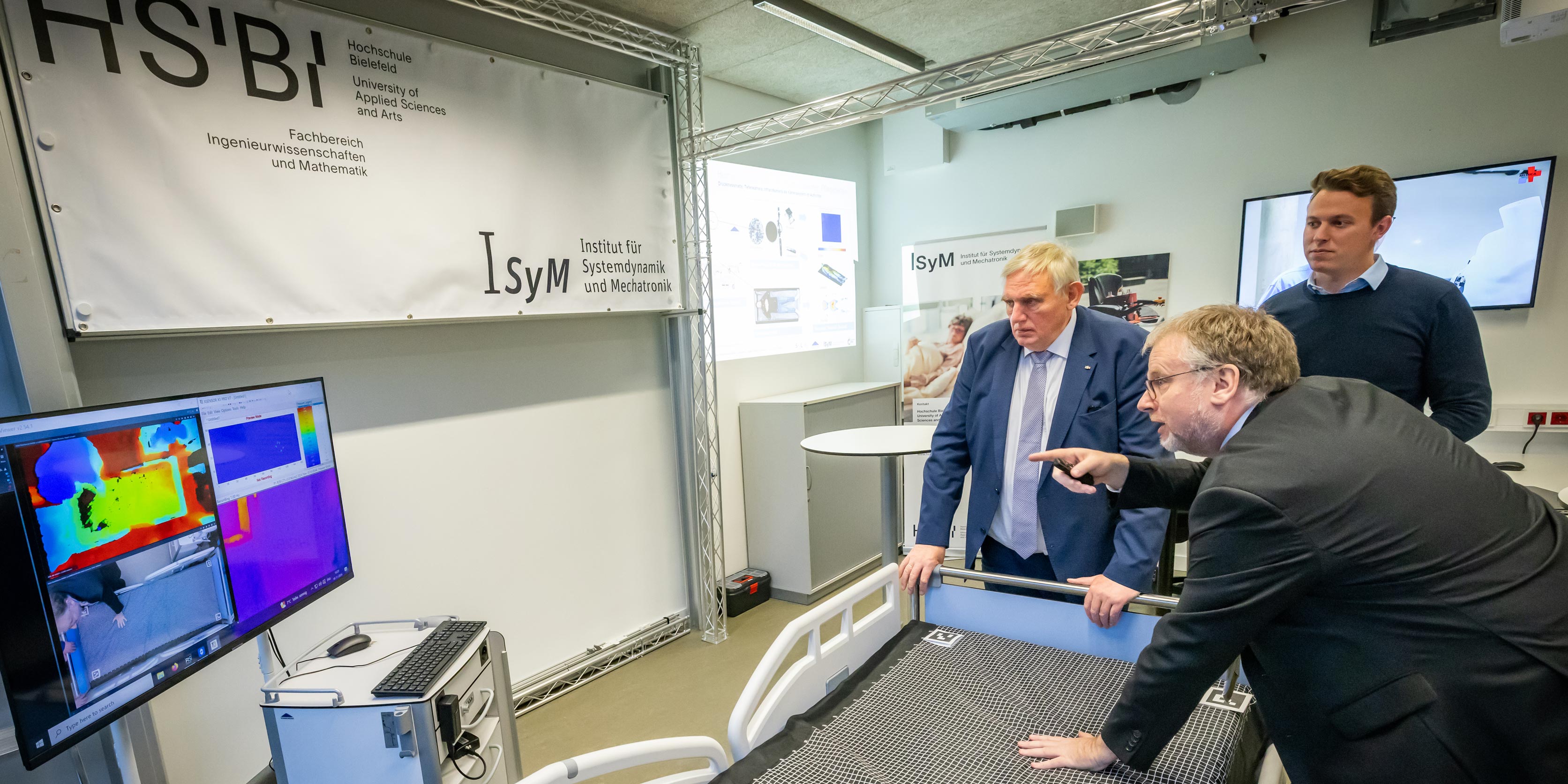 NRW-Gesundheitsminister Karl-Josef Laumann (vorne Mitte) informierte sich an der HSBI beim CareTech OWL-Netzwerk.
