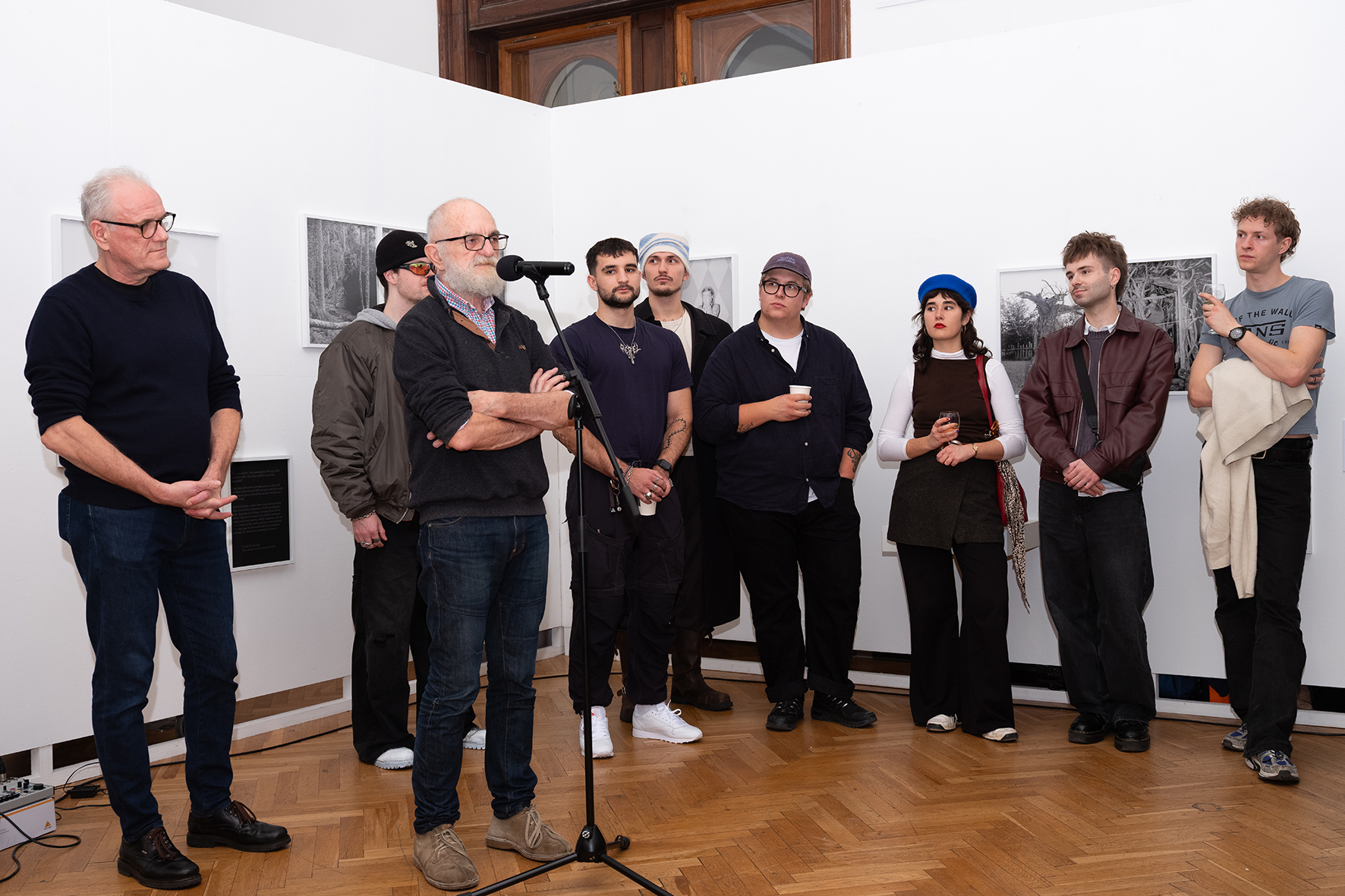 Bei der Eröffnung der Ausstellung in Bratislava. Prof. Roman Bezjak (l.) hat die Studierenden begleitet.