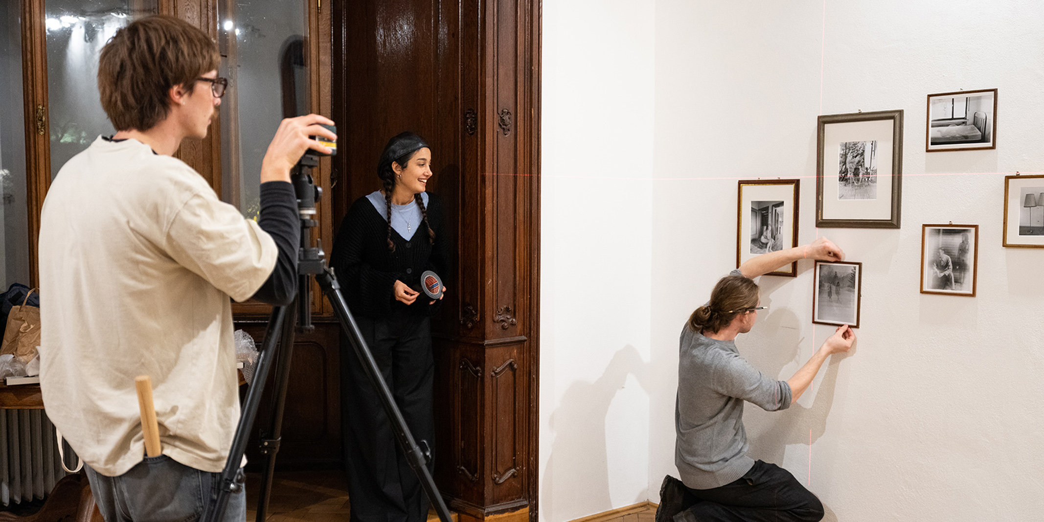 Drei Studierende hängen Bilder für ihre Ausstellung auf