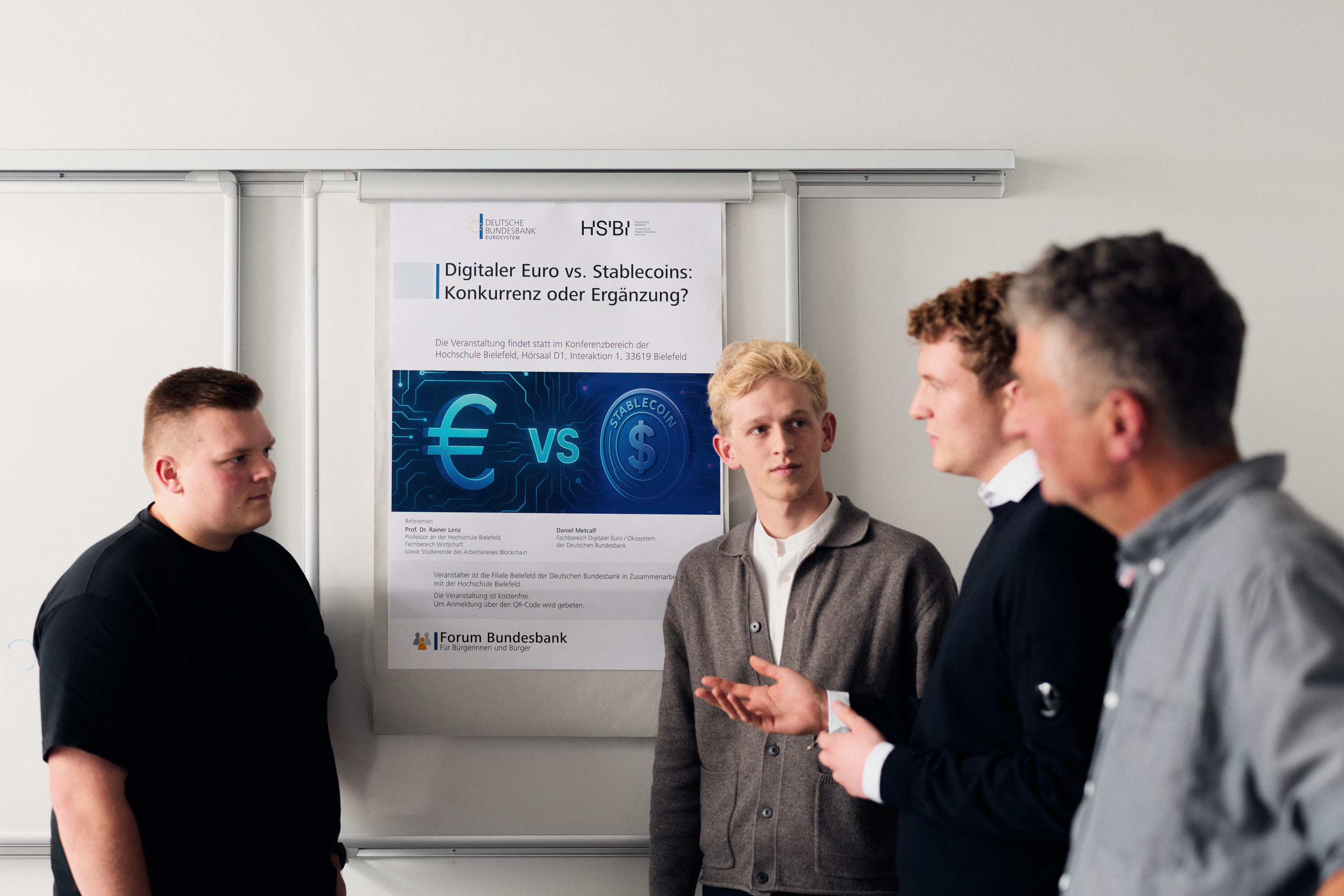 Vor drei Jahren hat der Arbeitskreis deshalb begonnen, Veranstaltungen zu aktuellen Themen aus der Finanzwelt zu organisieren, in denen die Studierenden ihren Kommiliton:innen Input beispielsweise zur Funktionsweise der Blockchain geben. „Lehre und Lernen geschieht auf einer Ebene, von Studierenden zu Studierenden, Peer-to-Peer“, beschreibt Rainer Lenz das Prinzip. Für die Lernenden ein niedrigschwelliger Einstieg in neue oder komplexe Themen. „Die Vermittlung von Inhalten durch andere Studierende, die meist etwa gleichaltrig sind, motiviert noch einmal anders, als wenn ich das übernehme. Und auch die Bereitschaft zu fragen und zu diskutieren steigt“, sagt Lenz. Der Erfolg spricht für das Format. Waren zur ersten Veranstaltung knapp dreißig Interessierte gekommen, konnten die Studierenden zum jüngsten Event, einer Kooperation mit der Bundesbank, rund hundert Gäste begrüßen.