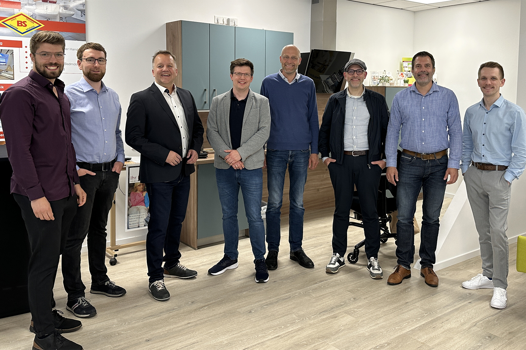 Das Team von KIMUP (v.l.n.r.): Justin Baudisch (HSBI), Dr. Christoph Ostrau (HSBI), Markus Wendler (PVM GmbH), Dr. Tim Herzig (HSBI und Reallabor Mobile Geriatrie), Dr. Stephan Held (Reallabor Mobile Geriatrie), Dr. Christian Marschner (Reallabor Geriatrie), Prof. Dr. Thorsten Jungeblut (HSBI und KogniHome e.V.) und Bernd Reger (PVM GmbH).