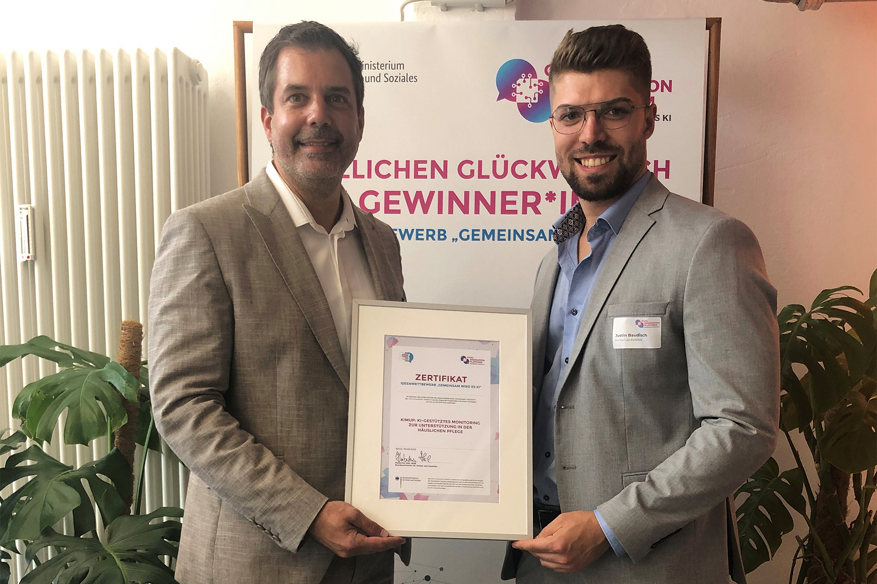 Künstliche Intelligenz kann im Sinne des Gemeinwohls genutzt werden – das zeigen zwei vom Bundesministerium für Arbeit und Soziales ausgezeichnete HSBI-Projekte. Eines bringt Innovation ins Bildungswesen, das andere hilft Angehörigen bei der Pflege und entlastet das Gesundheitswesen.Prof. Dr. Thorsten Jungeblut (l.) und Justin Baudisch von dem Projekt „KIMUP“ nahmen die Auszeichnung auf der re:publica in Berlin entgegen.