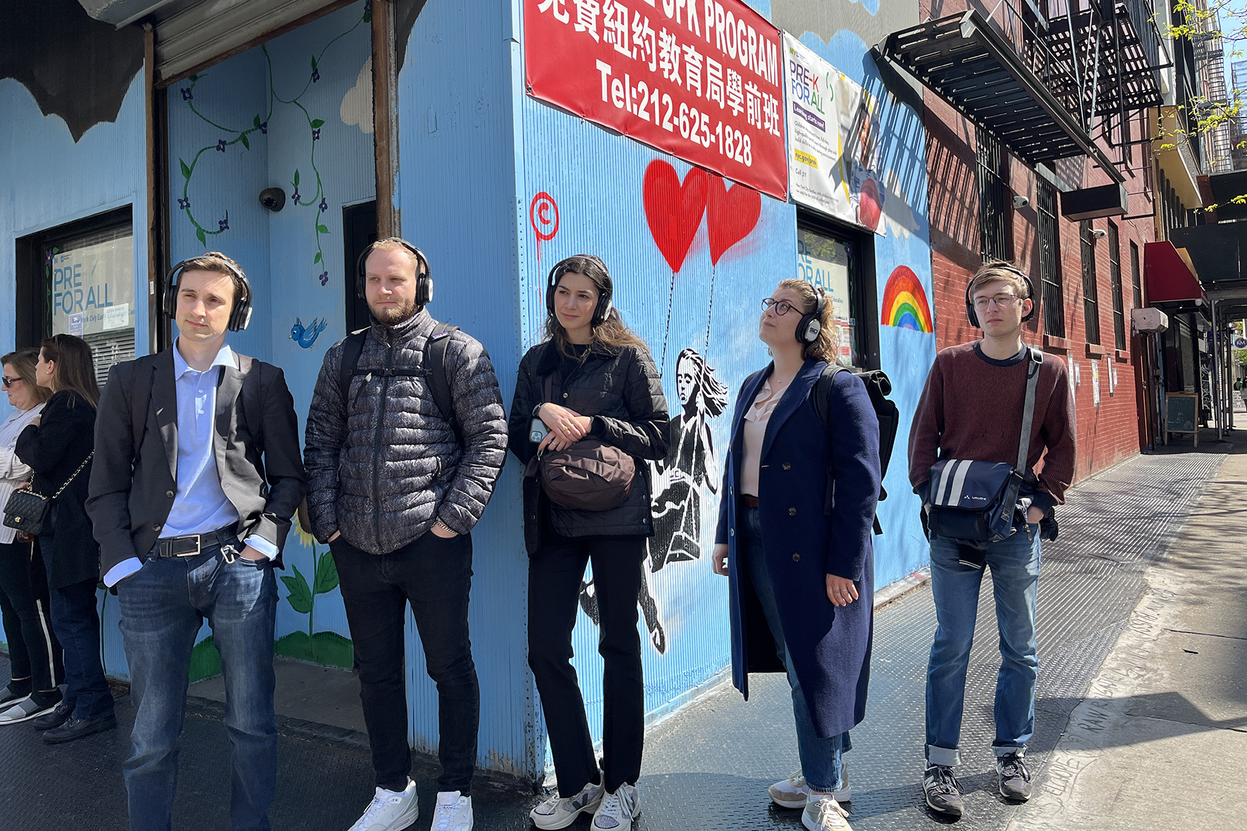 Zu Fuß und mit Kopfhörern entdecken die sieben Studierenden aus OWL Downtown Manhattan. Geleitet wird die immersive Walking Tour von den Journalist*innen Felix Zeltner und Christina Horsten