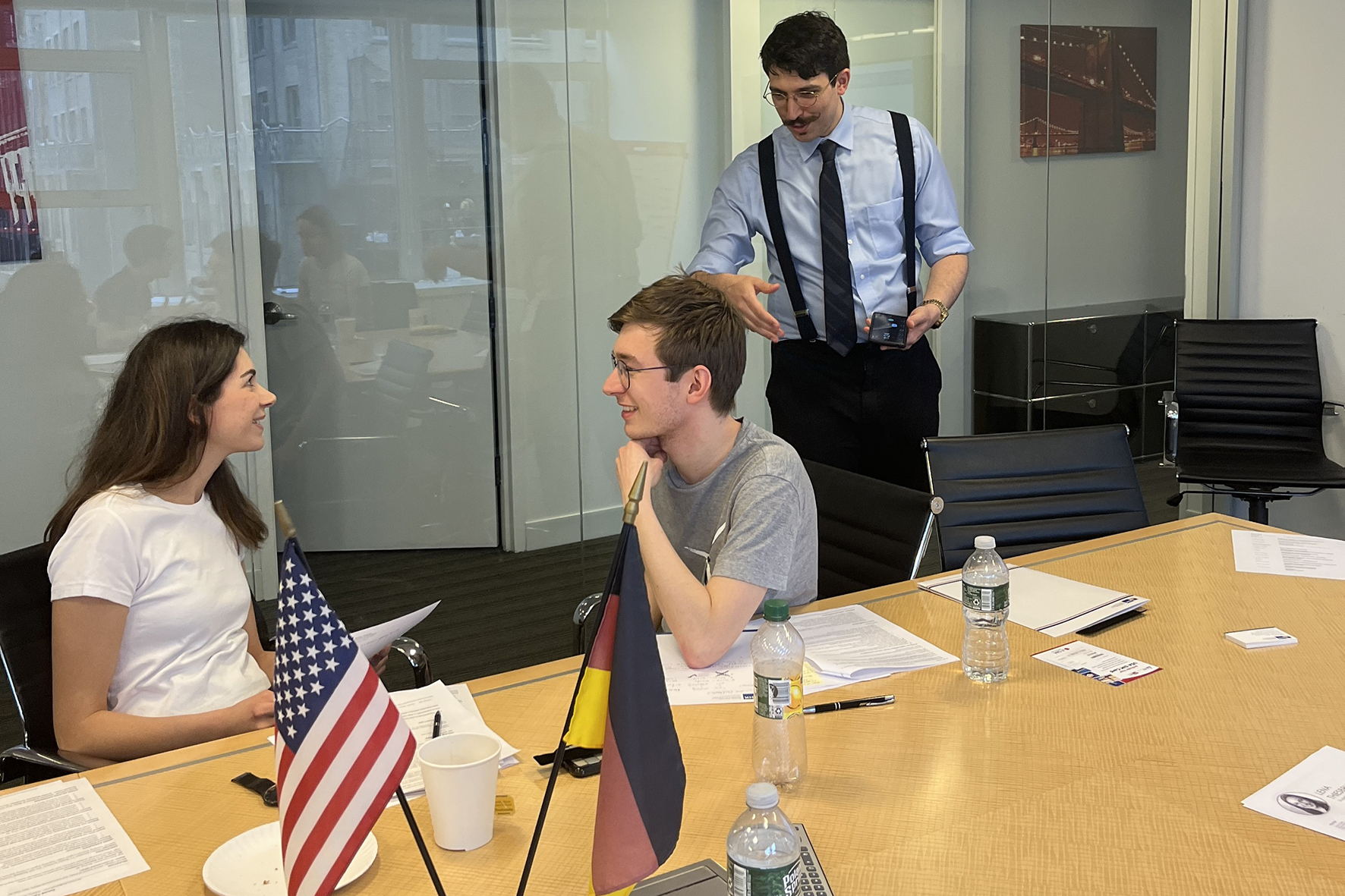 Betül (links) und Jasper (Mitte) erhalten Tipps zu ihren Lebensläufen von David Tarsha (Deutsch-Amerikanische Handeskammer)