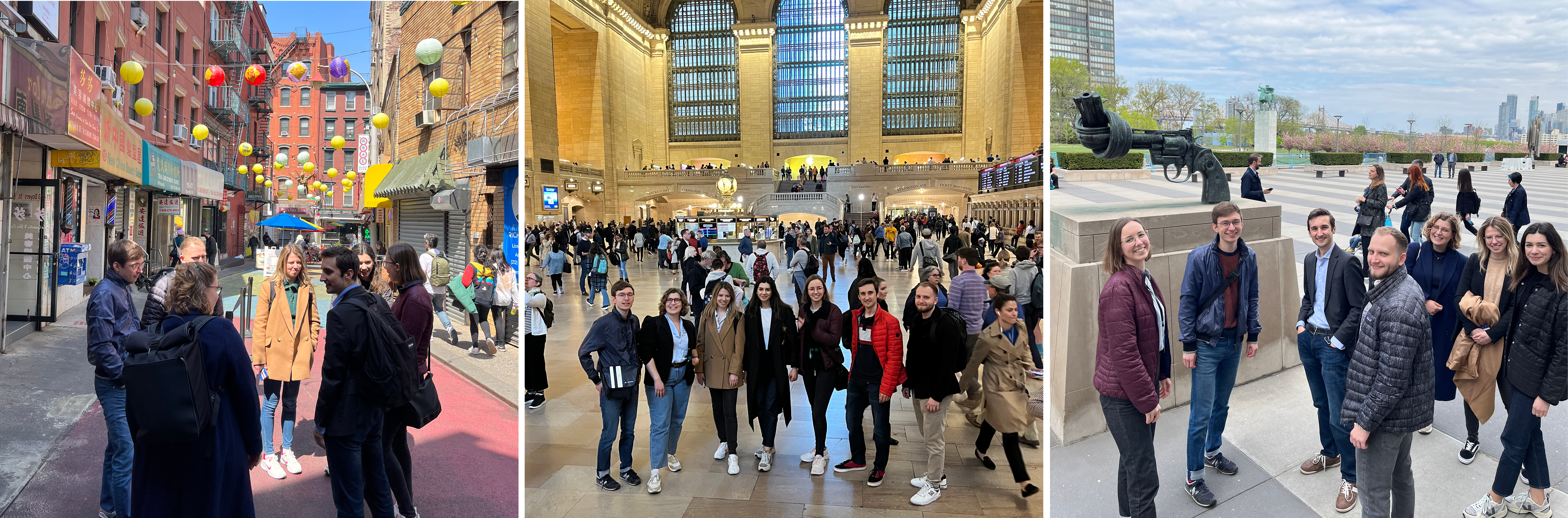 Die Studierenden aus OWL erkunden die Stadt, hier Chinatown (links), die große Haupthalle der Grand Central Station (Mtte) und das Gebäude der Vereinten Nationen (rechts).