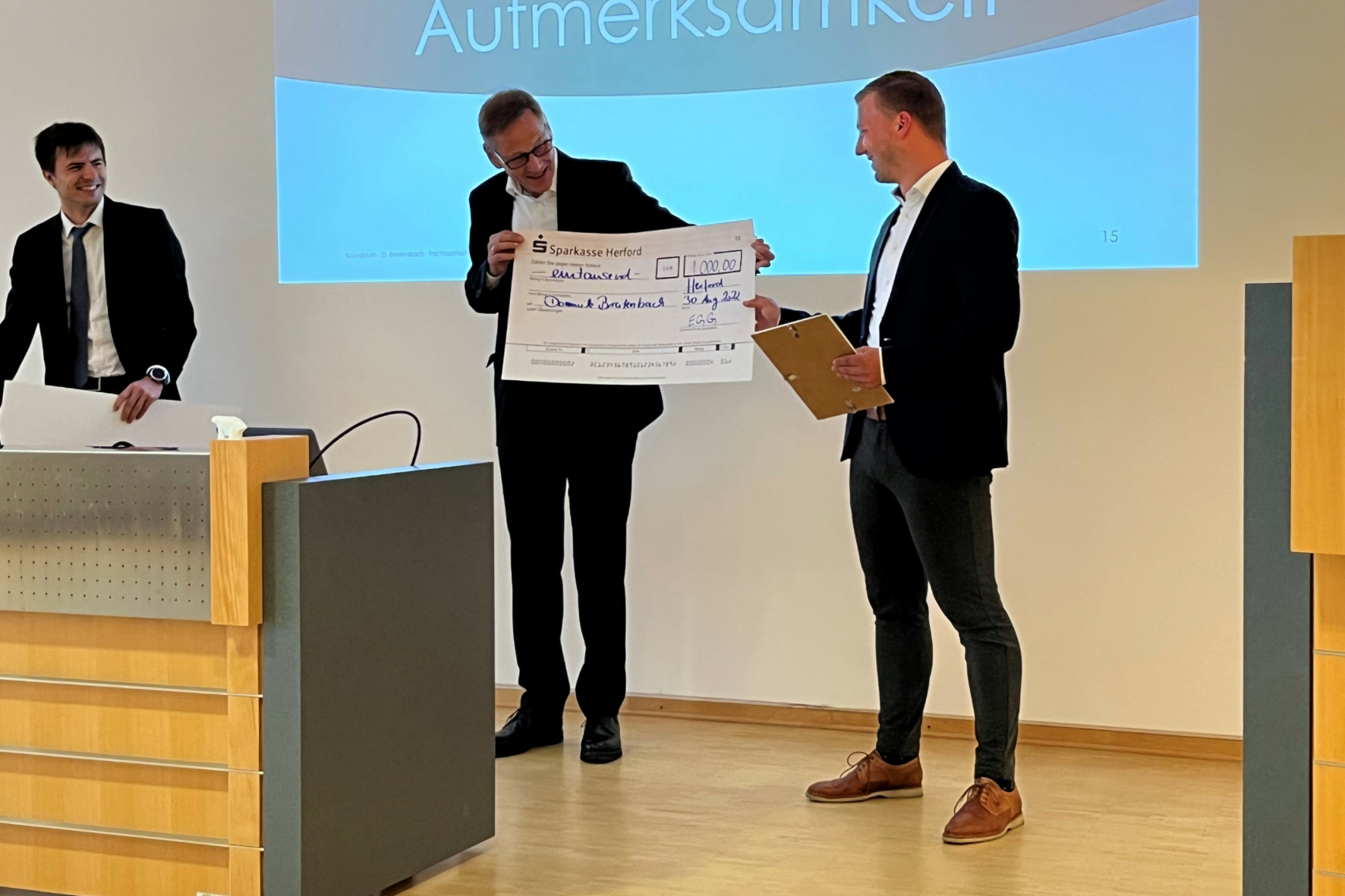 Bielefeld (fhb). Der Titel ist etwas sperrig. „Modellierung und Anwendung eines Sustainability-Measurement-Konzepts für die Bewertung und Quantifizierung der Nachhaltigkeit von ESG-Investmentfonds“ heißt die Bachelorarbeit von Dominik Breitenbach, Absolvent des berufsbegleitenden Studiengangs Betriebswirtschaft am Campus Gütersloh der Fachhochschule (FH) Bielefeld. Umso eingängiger ist das Urteil des Gutachters: „Sehr praxisrelevant, sehr komplex und sehr aktuell“, sagt Prof. Dr. Andreas Uphaus, am Fachbereich Wirtschaft der FH Bielefeld zuständig für das Lehrgebiet Allgemeine BWL, Finanzwirtschaft und Rechnungswesen. Und sehr preiswürdig, befand Prof. Dr. Ulrike Settnik, Zweitbetreuerin und am Fachbereich Wirtschaft ebenfalls zuständig für das Lehrgebiet Allgemeine BWL und Rechnungswesen. Sie schlug die Arbeit für den Preis vor, den die Erich-Gutenberg-Gesellschaft (EGG) regelmäßig für herausragende Abschlussarbeiten vergibt. Mit Erfolg.