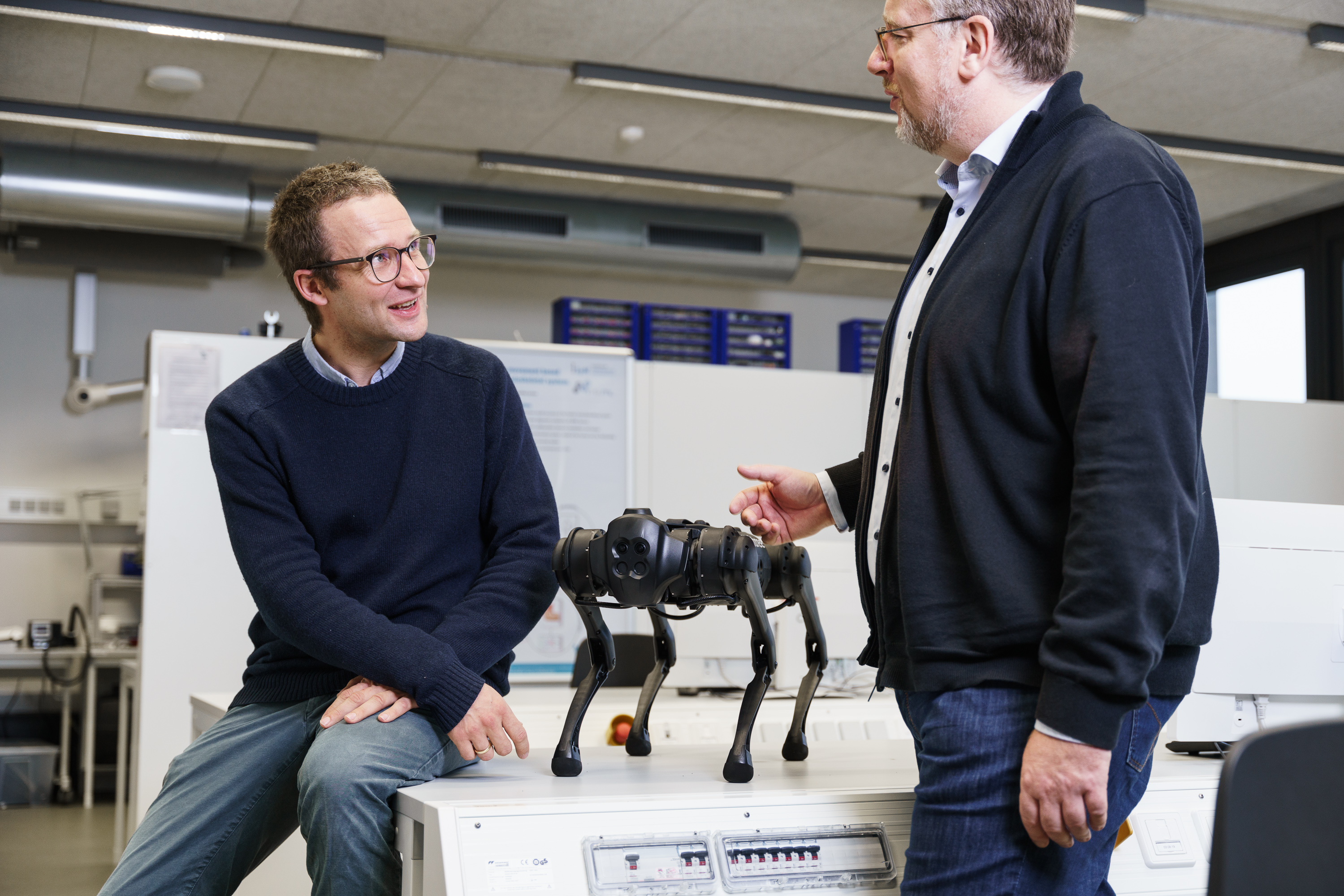 Mit Ben Raeke und Jonas Grube hat Roboterhund Achilles zurzeit zwei „Herrchen“ gefunden. Die beiden FH-Studierenden befinden sich gerade in der Praxisphase ihres Studiums der Ingenieurinformatik und sind sichtlich fasziniert von ihrem „Bürohund“. „Momentan untersuchen wir, wie wir die Gelenke von Achilles direkt ansteuern können, um unsere eigenen Steuerungsalgorithmen aufzusetzen“, berichtet Raeke. „Wir möchten auf dem Roboter einen natürlicheren Laufstil implementieren. Das würde auch dazu führen, dass er sich leiser bewegen könnte.“