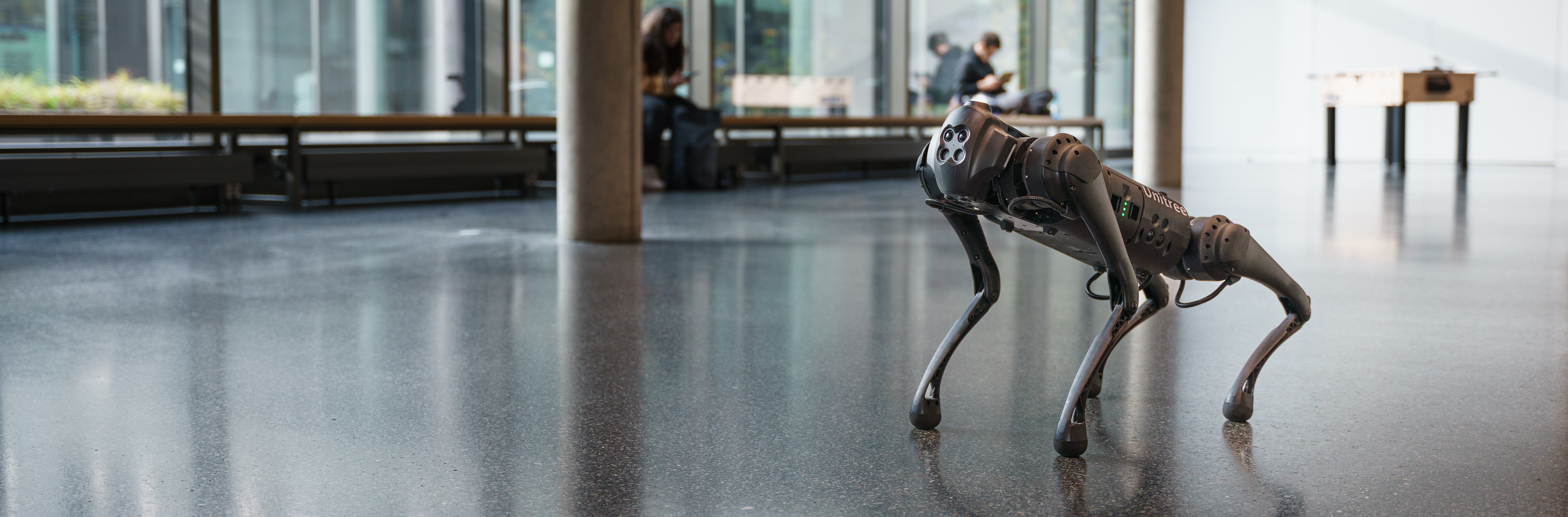 Achilles stampft nahezu im immer selben Takt, was häufig übertrieben hektisch wirkt und auf hartem Untergrund recht laut ist. Trotzdem würde er alsbald nicht weiterkommen, wenn das Terrain anspruchsvoller wird. Doch genau das fordert die Forschenden an der FH heraus. Sie wollen dem Roboter tief unter die „Motorhaube“ blicken. Beim Unitree Go1 EDU, den es in abgespeckter Hobbyversion auch für Menschen gibt, die sich für Roboter interessieren, sind zwar bereits feste Gangarten implementiert, aber sie können sich nicht eigenständig an unterschiedliche Bedingungen wie unebenen Untergrund oder Hindernisse anpassen. Noch nicht! Die Forschenden wollen Achilles nun das Laufen neu beibringen –eine keineswegs banale Angelegenheit.