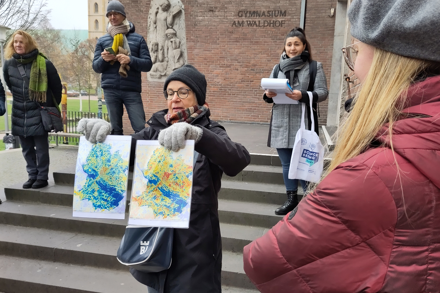 Die letzte Station findet im Park der Menschenrechte rund um die freigelegte Lutter statt. Hier steht die Anpassung des Menschen an immer steigende Temperaturen im Fokus. Der Park leistet seinen Beitrag zu einem angenehmen Stadtklima: Schattenspendende Bäume und der freifließende Bach kühlen die Umgebungstemperatur an heißen Tagen herunter. Teilnehmerin Ronja Bechauf findet diese Station besonders spannend: „Als Raumplanerin interessieren mich städteplanerische Themen natürlich immer. Es ist toll, wie vielfältig die Tour ist.“