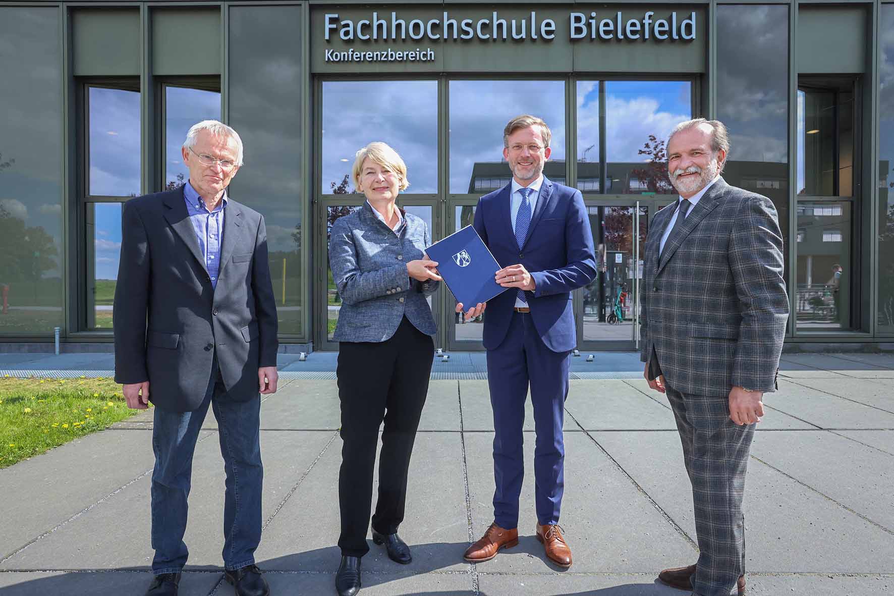 Vorne: Katrin Linssen (Ministerialrätin MKW NRW), Prof. Dr. Ingeborg Schramm-Wölk (Vorsitzende Campus OWL und Präsidentin der FH Bielefeld), Dr. Dirk Günnewig (Staatssekretär MKW), Prof. Dr.-Ing. Rainer Rasche (Fachbereich Elektrotechnik und Technische Informatik TH OWL).