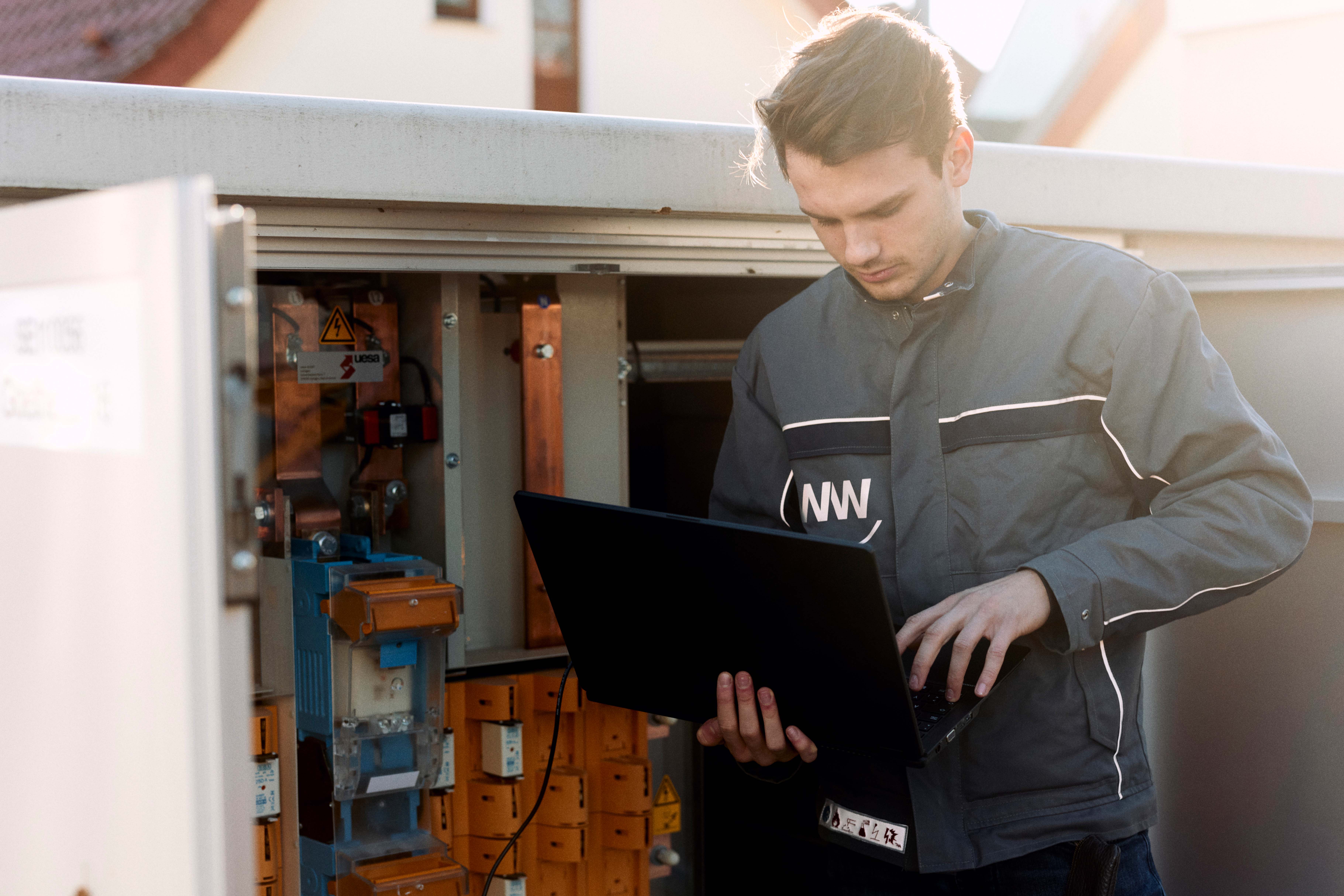 Vor Ort – das ist beispielsweise in Herford: Ein großer grauer Kasten mit breiten Lüftungsschlitzen steht in einem Wohngebiet am Straßenrand. An der Seite prangt ein gelber Aufkleber mit schwarzem Blitz: eine Ortsnetzstation. In ihr wird ankommende Mittelspannung in Niederspannung transformiert, mit der dann die umliegenden Häuser versorgt werden. Marco Sawatzki öffnet die Station. Zum Vorschein kommen Kabel, Schalter, Zähler, ein Messfeld. Sawatzki schließt seinen Laptop an. „Jetzt kann man sehen, wie viel Strom aktuell von den Haushalten verbraucht wird. Eingespeist wird momentan offenbar nichts“, erläutert der Mitarbeiter der Westfalen Weser Netz, dem Industriepartner auf deutscher Seite im Projekt.
