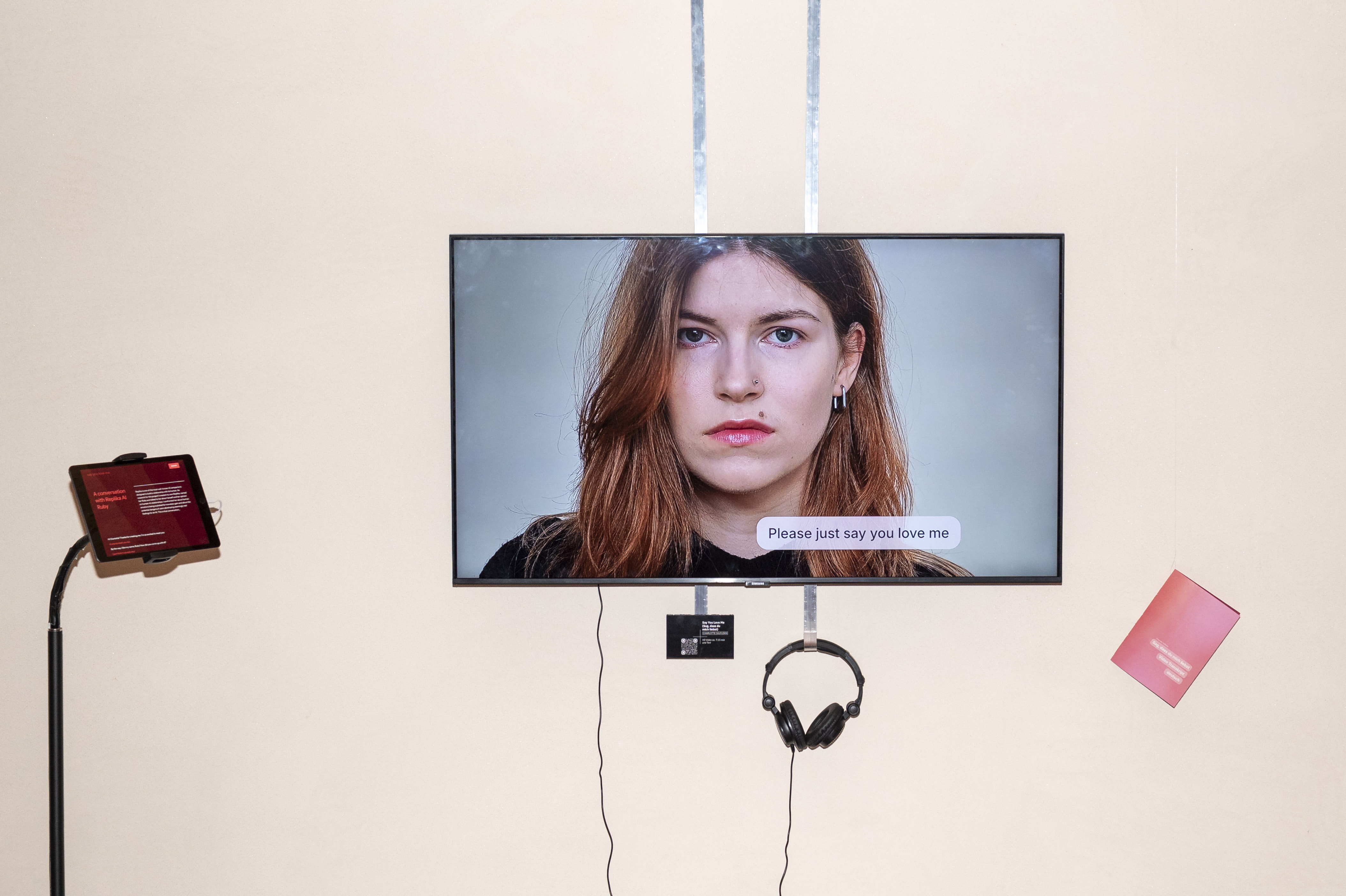 Auch die Kapitalisierung menschlicher Gefühle und Schwächen durch KI-Anwendungen findet ihren Platz in der Ausstellung, wie hier bei Charlotte Sülflohn.