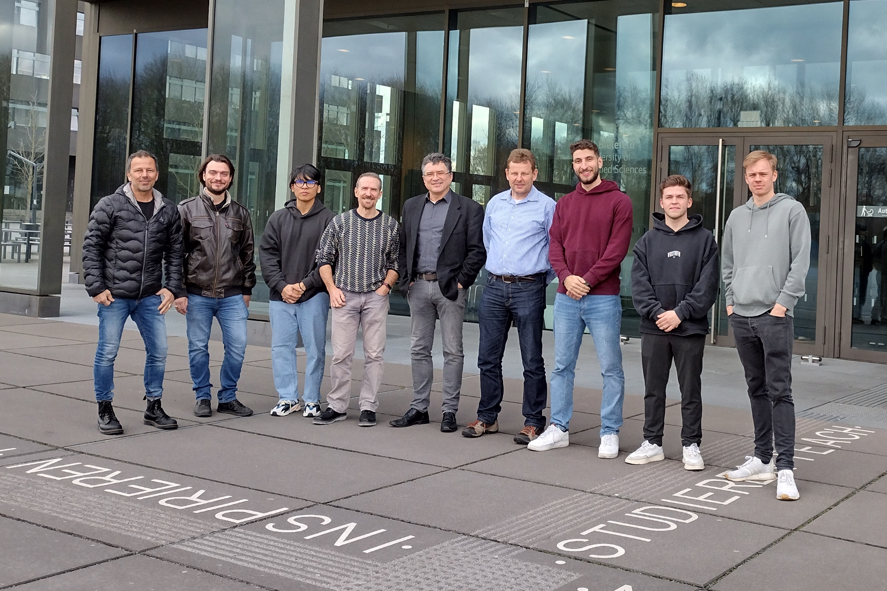 Ostwestfälisch-texanisches Elektrotechnik-Team: (v.l.) Dipl.-Ing. Carsten Fromm (HSBI), Max Lesser (TAMU), Kiet Pham (TAMU), Prof. Stavros Kalafatis (TAMU), Prof. Dr. Rüdiger Schultheis HSBI), Prof. Dr. Carsten Kleiner (zu Gast von der Hochschule Hannover), Firas Ghanem (TAMU), Tobias Castrup (HSBI), Daniel Henn (HSBI).