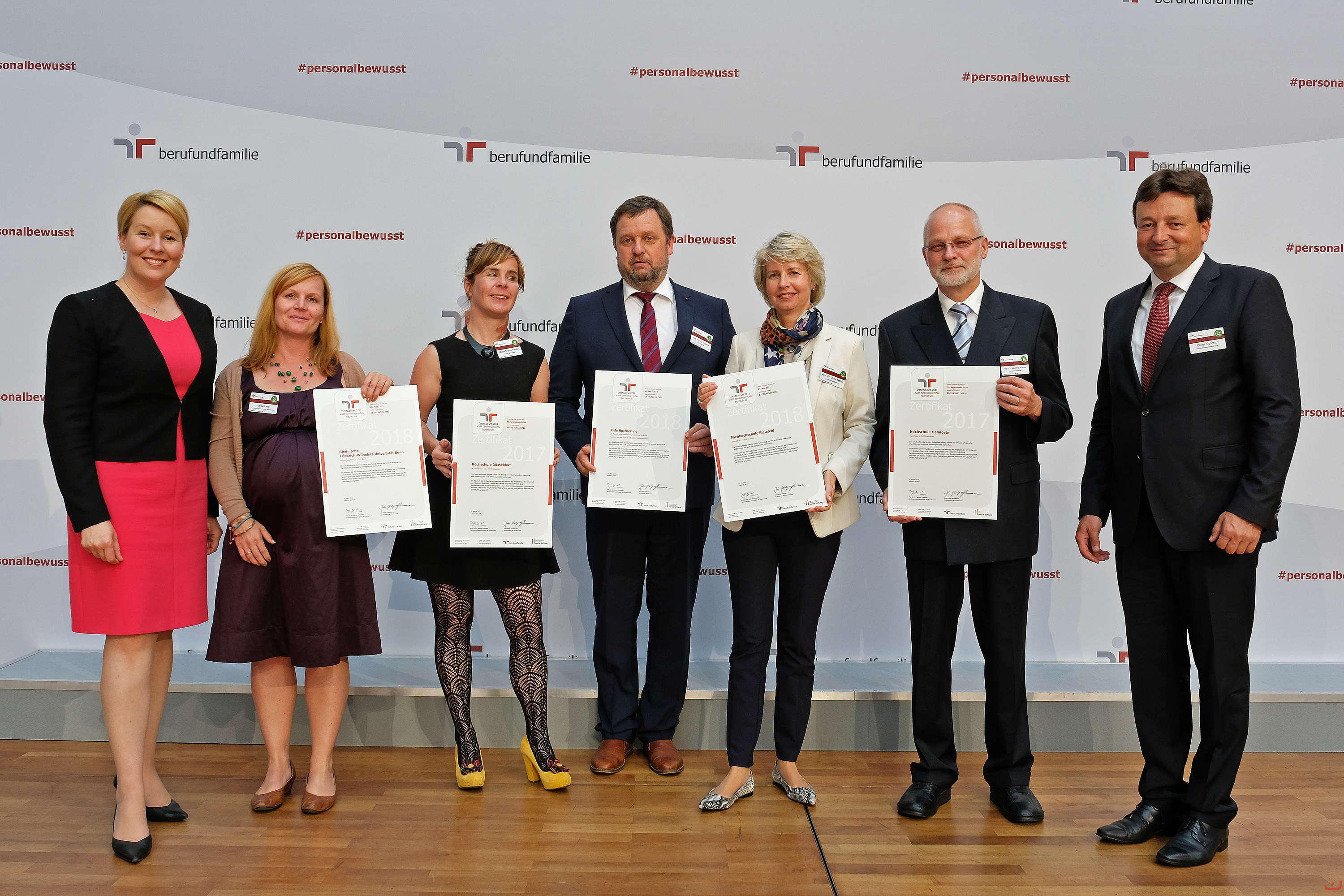 Bielefeld (fhb). Der Fachhochschule Bielefeld ist am 27. Juni in Berlin zum dritten Mal das Zertifikat "audit familiengerechte Hochschule" verliehen worden. Die Projektleiterin Prof. Dr. Ulrike Settnik nahm das Zertifikat aus den Händen der Bundesfamilienministerin Dr. Franziska Giffey entgegen, welche die Schirmherrschaft für das Audit trägt. Insgesamt wurden 69 Zertifikate an Unternehmen, öffentliche Einrichtungen und Hochschulen erteilt, darunter waren lediglich drei Hochschulen, die zum dritten Mal erfolgreich begutachtet wurden. Die Bundesfamilienministerin lobte ausdrücklich die Anstrengungen der ausgezeichneten Institutionen zur Verbesserung der Vereinbarkeit von Familie, Beruf und Studium und bestärkte sie darin, den eingeschlagenen Weg weiter zu beschreiten.