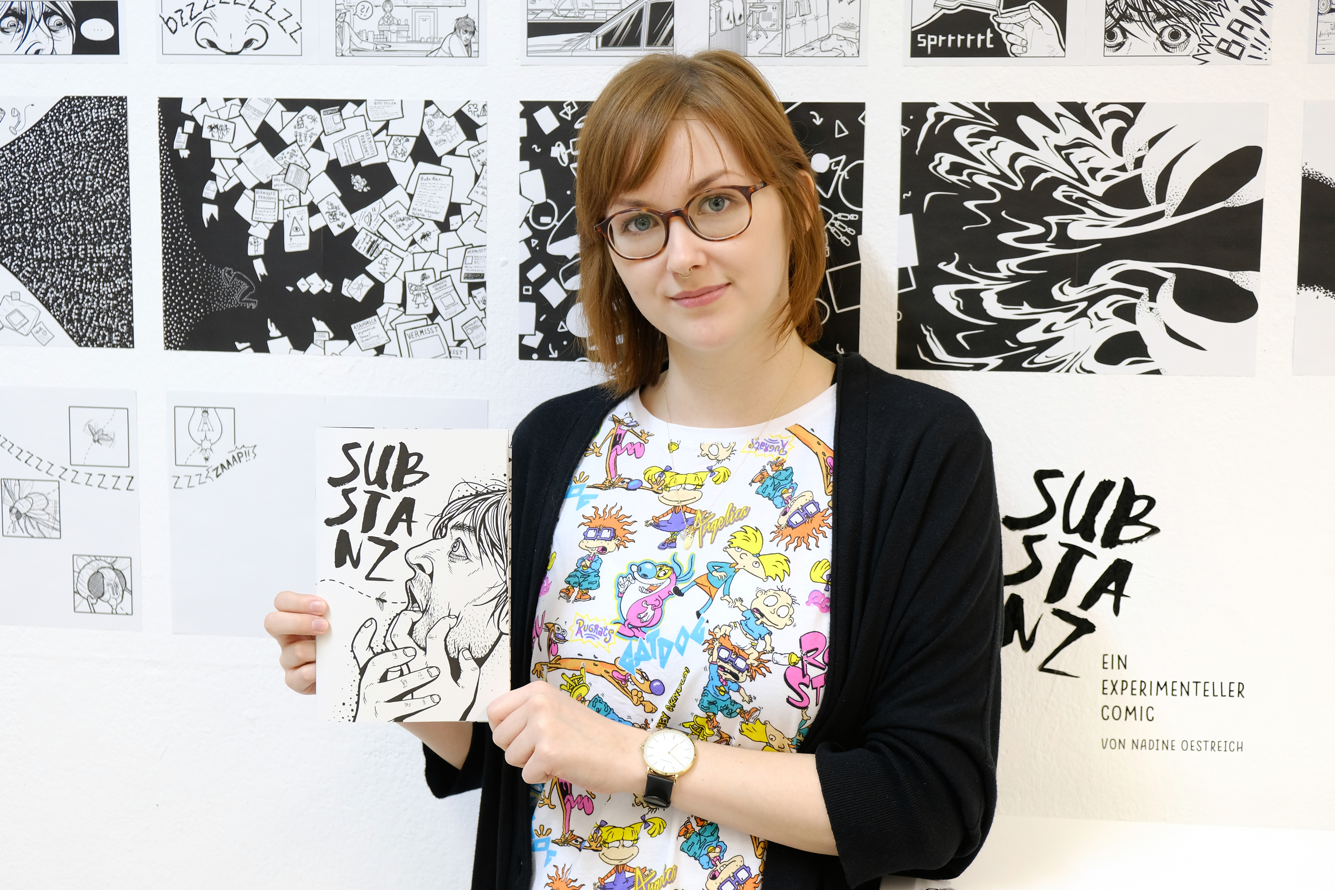 Eine der Absolventinnen der Studienrichtung Grafik und Kommunikationsdesign ist Nadine Oestreich. In ihrer Bachelorarbeit hat sie einen Comic gezeichnet, der sich von der populären Superhelden-Story abgrenzt und in eine experimentelle Richtung geht. „Ich wollte den klassischen Comic aufbrechen“, sagt Oestreich.