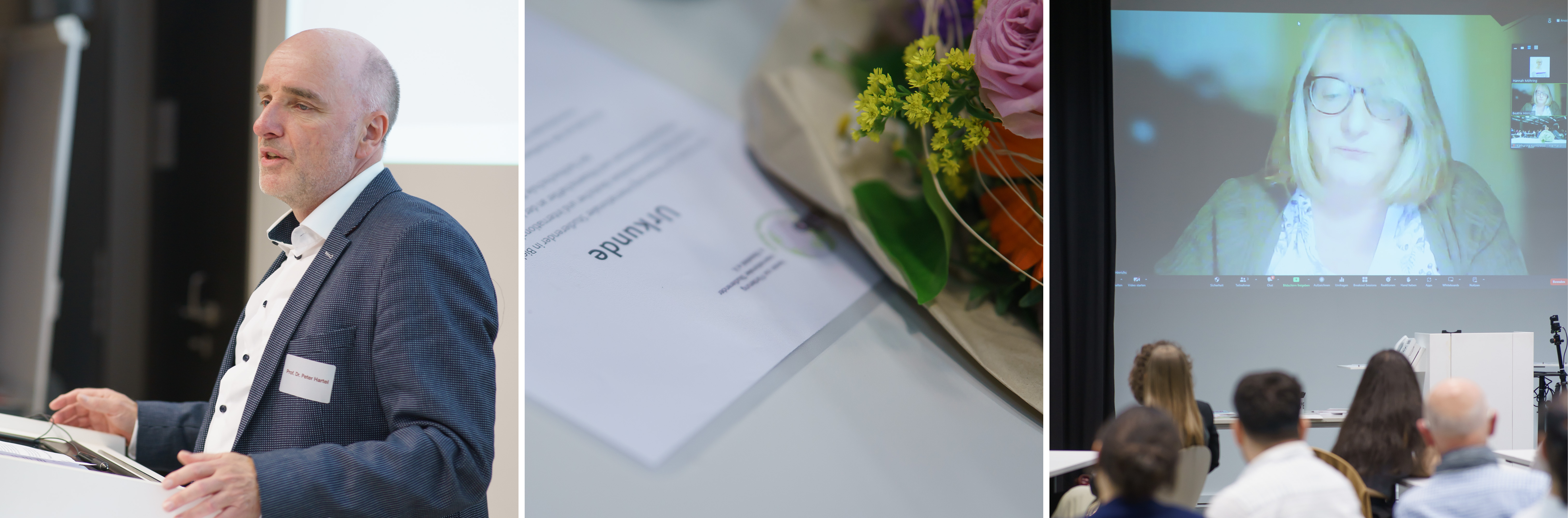Eine Collage von drei Fotos: Peter Hartel am Redepult, eine Ukrunde auf einem Tisch und eine Zuschaltung über Zoom an der Wand