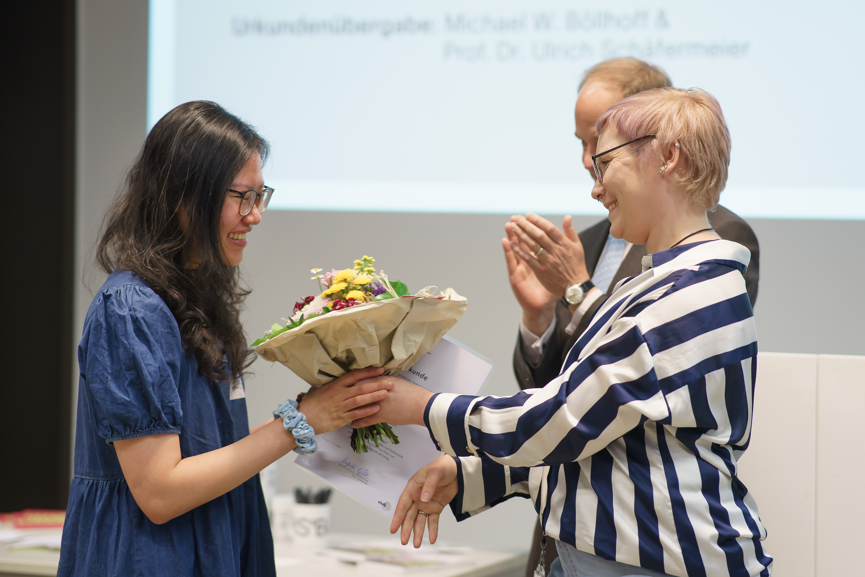 Thuy Linh Pham, Preisträgerin der HSBI, studiert praxisintegriert Wirtschaftsinformatik im Bachelor am Fachbereich Wirtschaft. Ihr Studium an der HSBI begann die Vietnamesin im Wintersemester 2020. „Sie war zu diesem Zeitpunkt nicht nur den Herausforderungen des Studiums ausgesetzt, sondern hat in der Hochzeit der Corona-Pandemie auch eine Zeit für ihren Start in Deutschland erwischt, die vor allem ohne Netz durch die Familie und Freund:innen in einer ihr fremden Stadt mehr als schwierig war“, so Prof. Dr. Peter Hartel, Professor am Fachbereich Ingenieurwissenschaften und Mathematik, in seiner Laudatio. Trotz diesen Herausforderungen zeichnete sich Thuy Linh Pham durch herausragende akademischen Leistungen, sowohl in der Hochschule als auch während ihren Praxisphasen im kooperationsunternehmen Diamant Software GmbH, begründete Hartel die Nominierung.