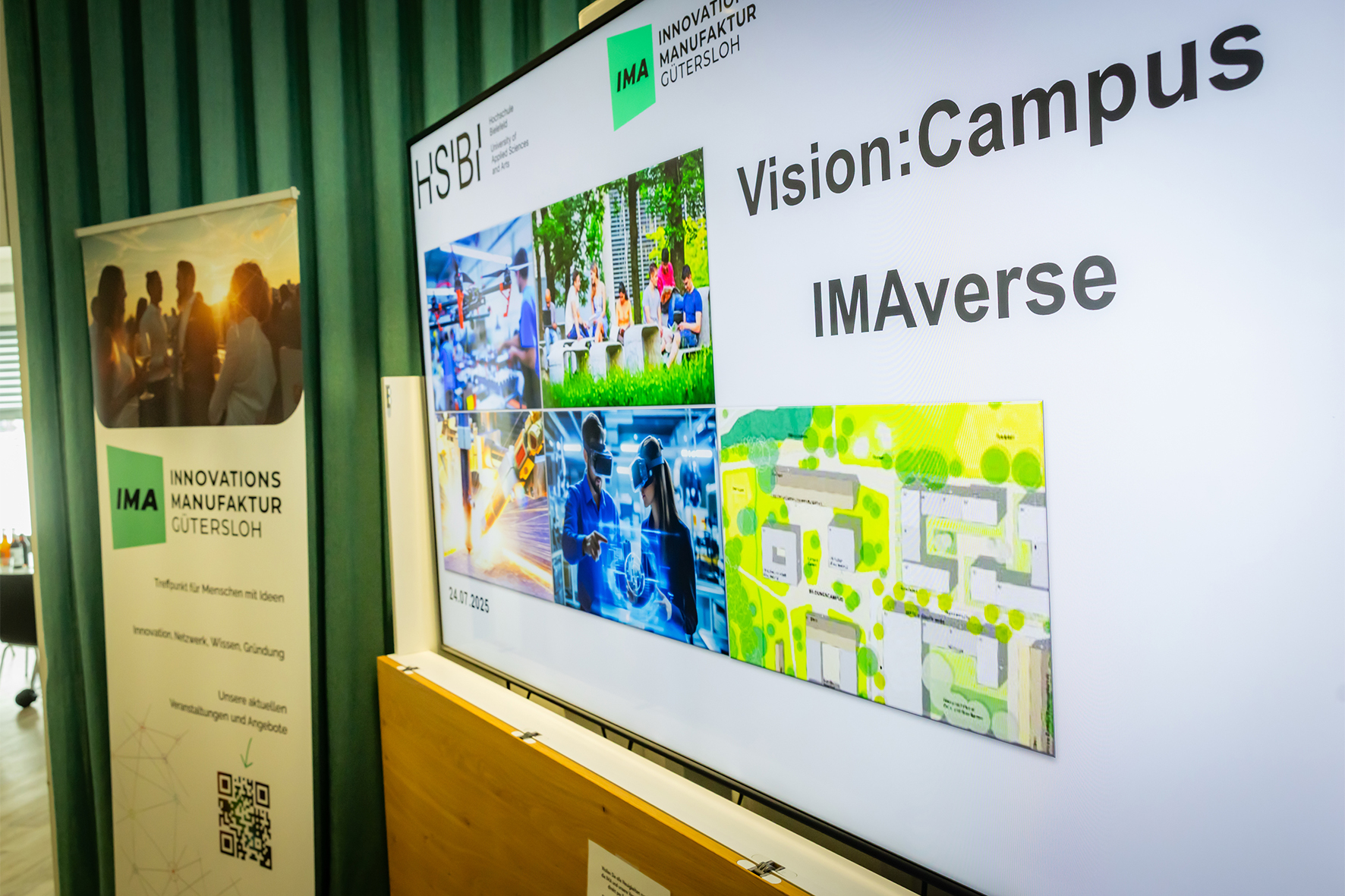 Zum Hintergrund: Zurzeit ist die HSBI in Gütersloh an zwei vergleichsweise kleinen Standorten vertreten. Die Hochschule stößt nicht nur räumlich an ihre Grenzen. Auch die Zusammenarbeit von Studierenden, Lehrenden und Unternehmen ist auf diese Weise gehemmt, ein Campus-Leben nur eingeschränkt möglich. Künftig möchte die HSBI in Gütersloh nur noch an einem entwicklungsfähigen Standort lehren und forschen, an dem auch die IMA zu Hause sein soll. Die über die vergangenen Jahre intensivierte inhaltliche Zusammenarbeit der beiden Institutionen bringt inzwischen zahlreiche innovative Ideen und Transferprojekte zwischen Wissenschaft und Wirtschaft hervor. Daher wird auch die infrastrukturelle Zukunft von HSBI und IMA von den Akteur:innen nur im Tandem „gedacht“. Noch ist die Standortfrage zwar nicht entschieden, eine Bedarfsanalyse steht, eine Variantenanalyse ist in Arbeit. Aber einig sind sich IMA, HSBI wie auch proWiGT schon heute, dass an einem neuen Standort das Projekt Vision:Campus in Kombination mit dem IMAverse ein wichtiges Herzstück bilden sollte.