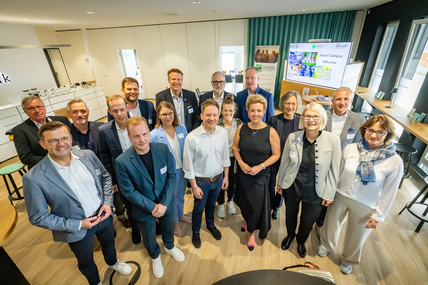 1. Reihe v.l.n.r.: Raphael Tigges (MdL), André Feuerer (Claas), Jörg Rodehutskors (IMA), Ministerin Ina Brandes, Prof. Dr. Ingeborg Schramm-Wölk (HSBI), Prof. Dr. Andrea Kaimann (HSBI), 2. Reihe v.l.n.r.: Prof. Dr. Ulrich Schäfermeier (HSBI), Anna Niehaus (proWiGT), Stefanie Herweg (Miele), Dr. Ursula Frank (Beckhoff), Christian Nüsser (Venjakob), 3. Reihe v.l.n.r.: Klaus Herbert Rolf (Claas), Dr. Marian Brackmann (HSBI), Thorsten Klute (MdL), Carsten Schlepphorst (Stadt GT), Oliver Pittig (Miele), Volker Willich (Willich Tauchmassen)