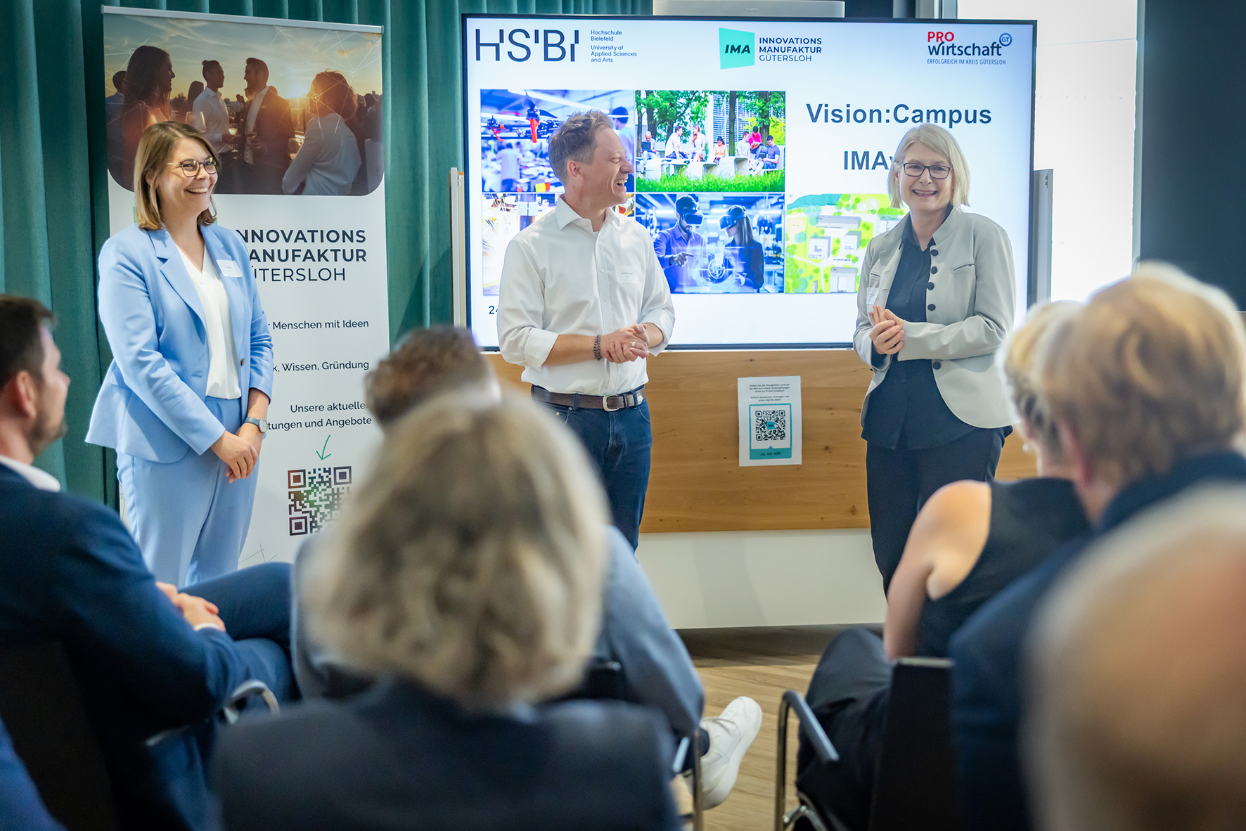 Gastgeber Jörg Rodehutskors, Geschäftsführer der IMA, im Gespräch mit HSBI-Präsidentin Prof. Dr. Ingeborg Schramm-Wölk (r.) und Anna Niehaus aus der Geschäftsführung von proWiGT.