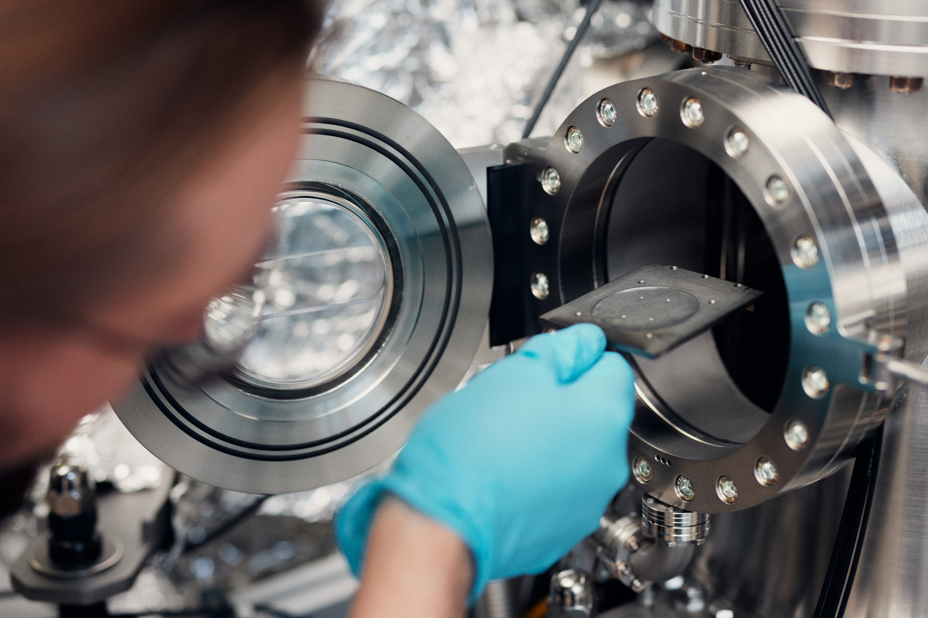 Wortmann befüllt eine Vakuumkammer mit einer Probe.