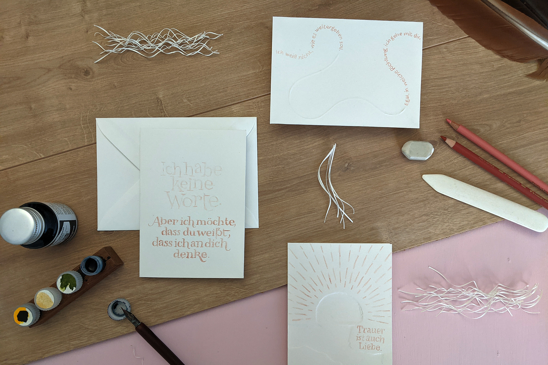 So ist die Designerin auf die Idee gekommen: Immer wieder kamen Kundinnen und Kunden in Marie Pischels Atelier für Schriftgestaltung im Bielefelder Osten, die von der Angebotspalette an Trauerkarten enttäuscht waren oder ganz besondere Wünsche hatten. Zwischen Gestaltung und Gesprächen wurde Marie Pischel klar, dass Trauerkarten mehr sein können als ein Stück Papier: nämlich eine Brücke zwischen Trauernden und Tröstenden.