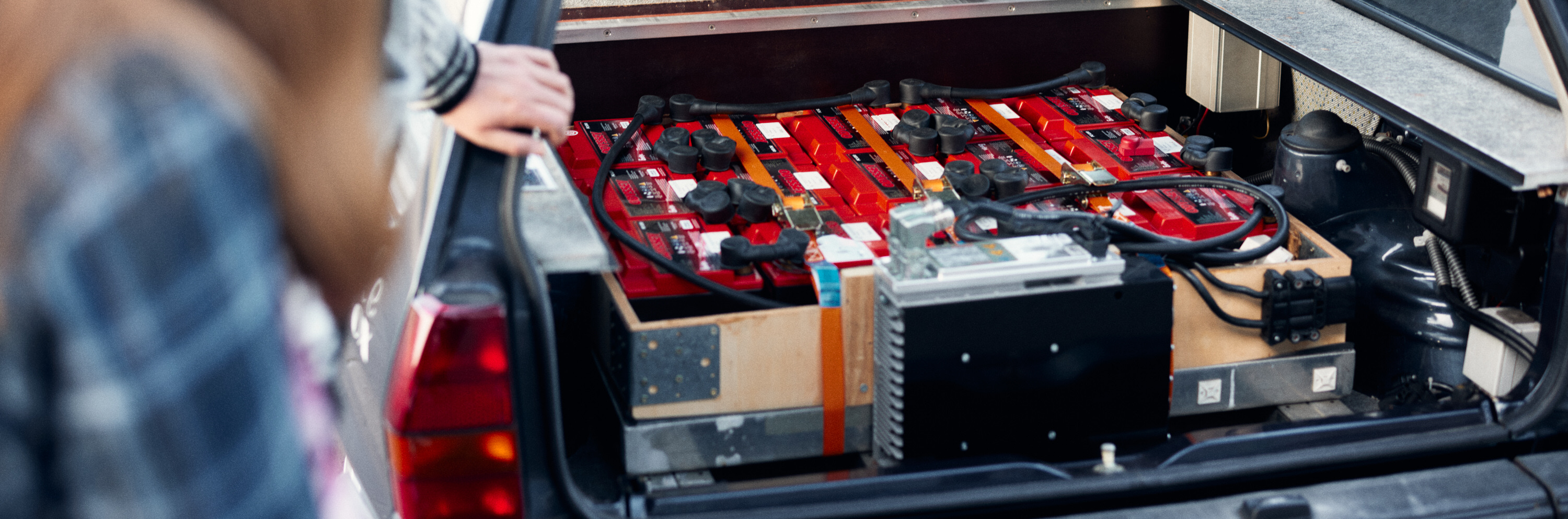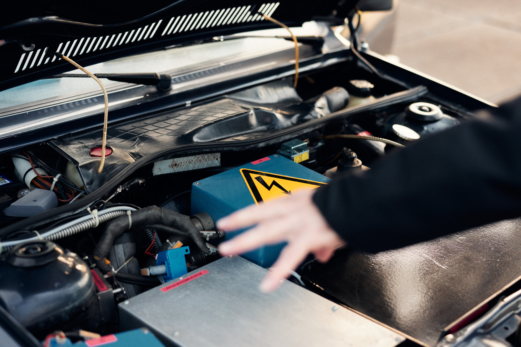 Seine Energie bezog der E-Fox aus 15 Blei-Säure-Batterien, die zusammen 300 Kilogramm auf die Waage brachten und im Heck sowie unter der Motorhaube Platz fanden. Die Batterien waren nicht nur schwer, sondern benötigten auch ihren Platz, sodass die zweite Sitzreihe weichen musste und der E-Fox zum zweisitzigen Stadtflitzer mutierte. Bei den Speichermodulen handelte es sich um sogenannte Traktionsbatterien, die sich zum Beispiel in Antriebssträngen von Gabelstaplern bereits bewährt hatten. Aufgeladen wurden die Module mithilfe von Strom, den eine eigens installierte Photovoltaikanlage produzierte. So wurde der E-Fox Kernstück eines rundum emissionsfreien Systems – auch das für die damalige Zeit visionär! Beim Bremsen – das ist heute Standard bei Hybrid- und Elektrofahrzeugen – war der E-Fox zudem in der Lage, mittels Rekuperation einen Teil der investierten Antriebsenergie wieder zurückzugewinnen.