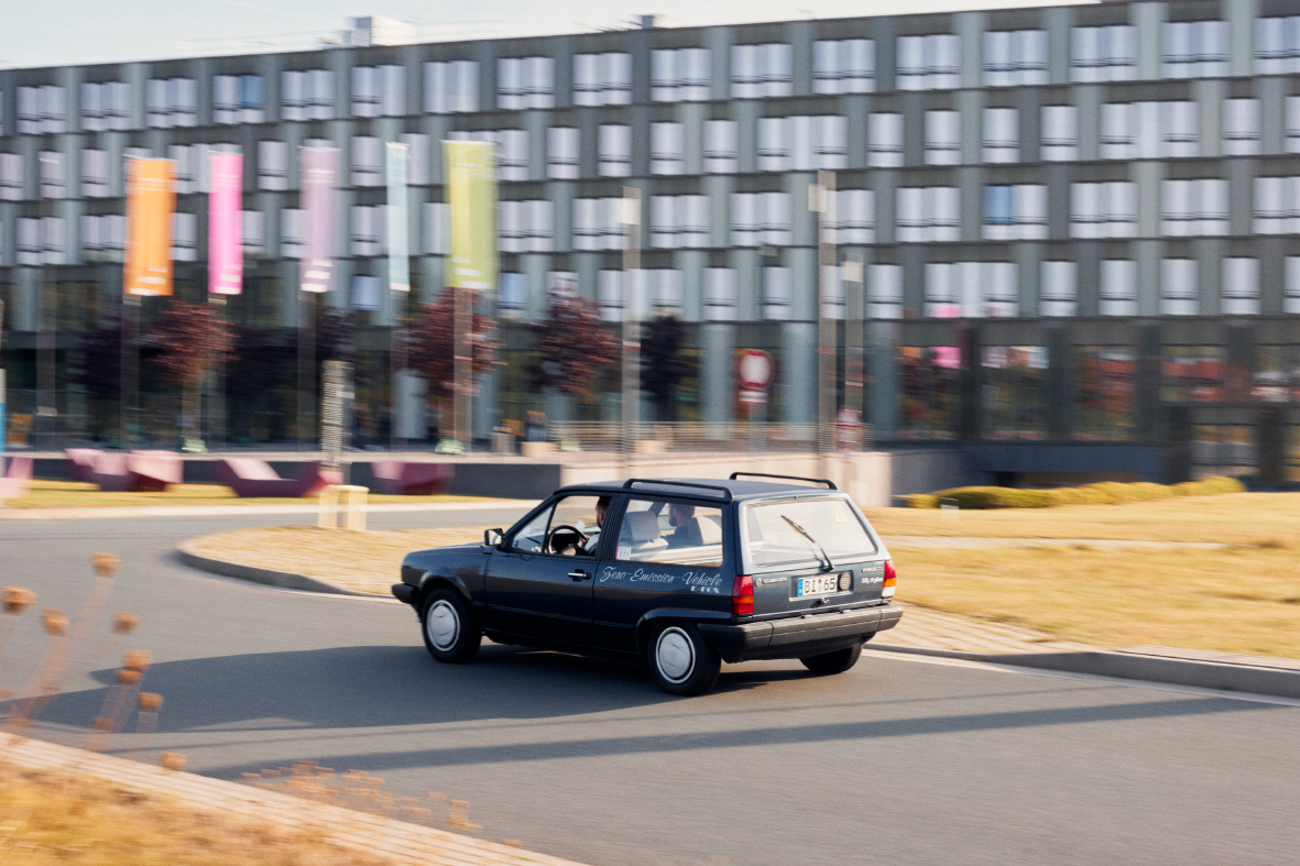 Doch der Reihe nach: Am 13. Januar 1994 meldet ein Team rund um Prof. Dr. Bernd-Josef Schumacher und Eckhard Trakies vom damaligen Fachbereich Elektrotechnik und Informationstechnik der FH Bielefeld ein „Zero Emission Vehicle“ bei der Zulassungsstelle der Stadt Bielefeld an. Bei dem Fahrzeug handelt es sich um einen umgebauten Polo „Fox“ der zweiten Generation. Die Studierenden haben seinen Verbrennungsmotor durch eine Drehstrom-Asynchronmaschine mit Frequenzumrichter des österreichischen Antriebsherstellers Thien ersetzt und den Tank durch eine Reihe von Batterien. So ausgerüstet kann der E-Fox fast lautlos auf bis zu 100 km/h beschleunigen. Seine Reichweite beträgt 50 km im Stadtverkehr. Doch damit das Fahrzeug einsatz- und verkehrssicher betrieben werden kann, sind weitere Aggregate eingebaut und aufeinander abgestimmt worden. Und es waren noch Umbauten an der Karosserie und am Fahrgestell notwendig – alles eigenständig ausgeführt vom zehnköpfigen Studierendenteam der FH, das damit ein Stück der Automobilgeschichte in OWL schreibt.
