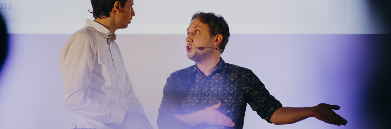 Zuerst löst sich aber die Stimmung im Konferenzsaal der Hochschule. Denn als Höhepunkt und Abschluss des ersten Demo Days kommen „Die Stereotypen“ Marvin Meinold und Ben Hartwig auf die Bühne. In ihrer gut 70-minütigen Improshow greifen sie immer wieder Versatzstücke der bisherigen Vorträge auf, persiflieren, interpretieren szenisch, kontextualisieren neu und bilden so immer wieder humoristische Zusammenfassungen des gesamten Abends. Kern ihrer Show sind zwei Interviews, in denen die Hauptthemen des Projekts unterhaltsam aufbereitet werden: Im ersten Gespräch mit Marvin Meinold erklärt Technologiescout Heike Wulf, vor welchen Schwierigkeiten Unternehmen bei der Implementierung zirkulärer Wertschöpfung stehen und wie InCamS@BI dabei helfen möchte.