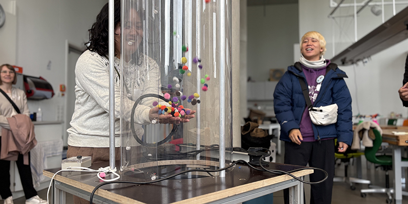 Neben den Vorträgen wurde es auch praktisch: Auf einem Rundgang mit Maximilian Köster vom Welcome Center des International Office der HSBI lernten die Gäste den Campus kennen. Im Schüler:innenlabor probierten sie Experimente aus, die hier regelmäßig mit Schulklassen durchgeführt werden. Und im Theater des Fachbereichs Sozialwesen erfuhren sie von Prof. Dr. Ingrid Hentschel, wie Theaterübungen für die Ausbildung sozialpädagogischer Fachkräfte genutzt werden, und versuchten sich unter Anleitung von Studierenden auch selbst an einer Übung.