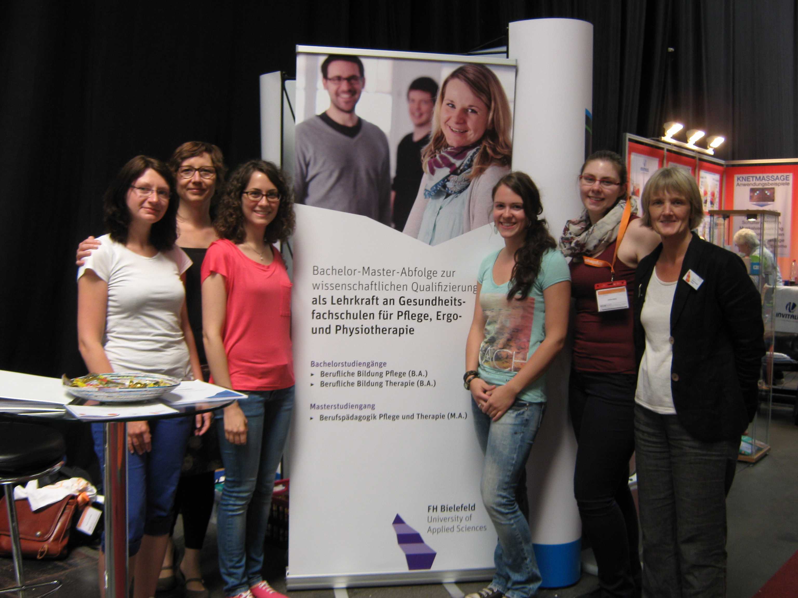 Der Informationsstand zu den Studienangeboten der Lehreinheit Pflege und Gesundheit der FH Bielefeld wurde durch sechs Studentinnen sowie eine Lehrende betreut. Die Kongressteilnehmerinnen fragten insbesondere den Masterstudiengang Berufspädagogik nach. Die Studentinnen erläuterten den Interessierten die unterschiedlichsten Fragen differenziert und umfassend. Hierbei zeigte sich, dass viele der Nachfragenden bereits einen Bachelorabschluss nachweisen konnten und berufsbegleitenden Studiengängen mit hohen Selbstlernphasen eine große Attraktivität zuwiesen. Darüber hinaus wurde der Wunsch nach einer fundierten Weiterentwicklung berufspädagogischer Kompetenzen formuliert.