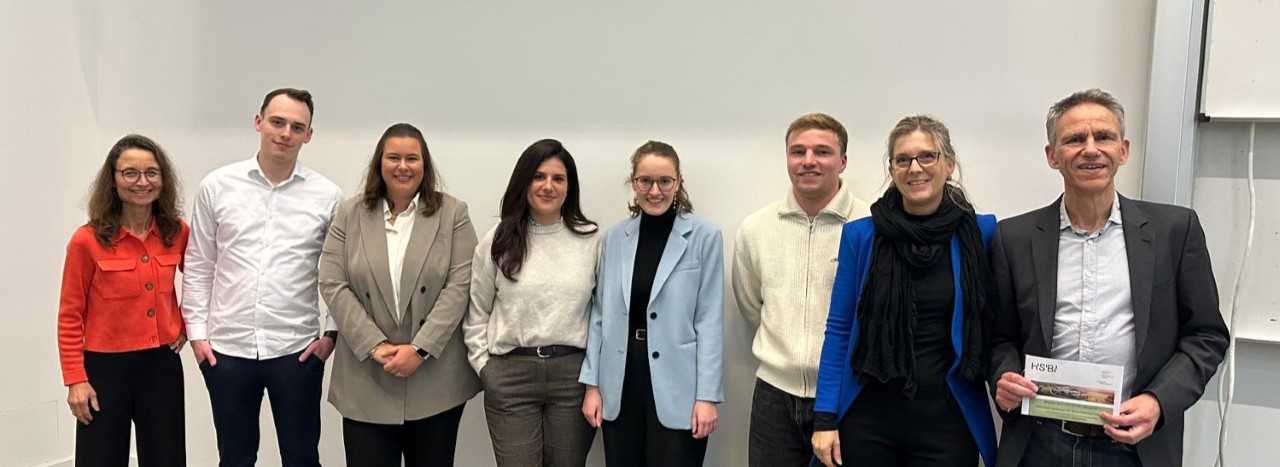 Der Übergang vom Studium in die Berufswelt bringt viele Fragen mit sich und so überraschte es nicht, dass der Hörsaal B3 am 03.12.2025 gut besucht war, als AbsolventInnen der Bachelor- und Masterstudiengänge Wirtschaftsrecht berichteten, wie es ihnen bei ihrem Berufseinstieg und in der weiteren beruflichen Tätigkeit ergangen ist. Und die fünf AbsolventInnen hatten tatsächlich viele Tipps für die angehenden WirtschaftsjuristInnen. „Seht zu, dass ihr möglichst viel Praxiserfahrung sammelt“, riet Alexandra Albin (Beckhoff Automation GmbH & Co. KG), „und vermeidet insbesondere in der ersten Zeit das Homeoffice, denn persönliche Präsenz stärkt Networking und Integration ins Unternehmen.“ Auch Gavin Schmidt (NTT DATA Business Solutions AG) unterstrich die Bedeutung praktischer Tätigkeiten schon während des Studiums. „Ich hatte nur ein einziges Bewerbungsgespräch, nämlich im zweiten Semester für eine Werksstudententätigkeit. Im Anschluss an meinen Bachelor bin ich dann direkt übernommen worden.“ Miriam Schicke (NTT DATA Business Solutions AG) ermutigte die Studierenden sich auszuprobieren und selbständig zu werden. „Geht ins Ausland, macht verschiedene Praktika, schaut was euch Spaß macht.“ Nico Oesterwalbesloh (Genoverband e.V.) erklärte, dass er zwar im Studium nicht die Vertiefungsrichtung „Steuern und Unternehmensprüfung“ gewählt habe, dennoch nun in der Wirtschaftsprüfung tätig sei. Hierfür habe das Wirtschaftsrechtsstudium wichtige Kompetenzen vermittelt, wie „die Art zu denken, zu lesen und systematisch an Sachverhalte heranzugehen“. Das bestätigte auch Prishila Hanelli (Rödl), zu deren Tätigkeit im Bereich „Daten und Technologie“ auch das „Hot Topic KI“ gehört. „Das gab es während meines Studiums noch nicht. Man muss als Juristin immer up to date bleiben. Jeder Tag ist anders, jeder Tag hat neue Herausforderungen. Aber ihr könnt diese Herausforderungen meistern, denn ihr werdet hier an der HSBI bestens vorbereitet.“