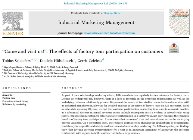 Der Artikel wurde unter dem Titel “Come and visit us!”: The effects of factory tour participation on customers in der Fachzeitschrift Industrial Marketing Management, der international führenden wissenschaftlichen Zeitschrift für B2B-Marketing, veröffentlicht und ist kostenfrei abrufbar unter https://doi.org/10.1016/j.indmarman.2025.01.004