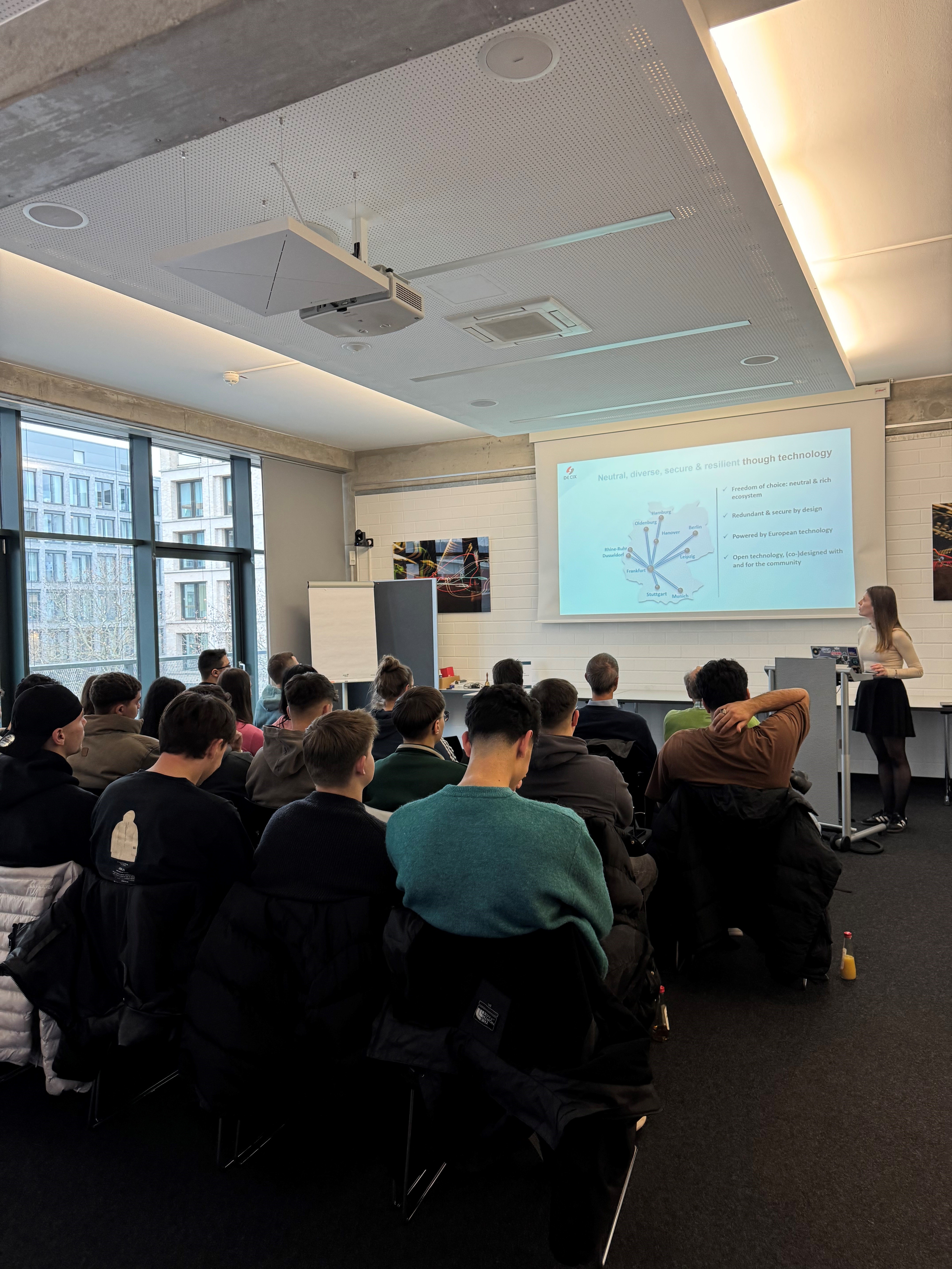 Im ersten Vortrag bei DE-CIX wurde das Unternehmen als solches vorgestellt. Dabei wurden beeindruckende Zahlen genannt, in wie vielen Städten DE-CIX vertreten ist und wie viele Netzwerke bzw. Autonome Systeme mit DE-CIX vernetzt sind. Ein weiterer Schwerpunkt war das Thema "Latenz ist die neue Währung". Unter anderem wurde berichtet, wie groß die Latenz bei Verbindungen über große Entfernungen ist und wie diese verringert werden kann. Der zweite Referent kam aus dem Bereich Research & Development bei DE-CIX. Voller Begeisterung für sein Gebiet berichtete er über den "all time peak" mit einem Datendurchsatz von 18,11 Tb/s sowie über die tageszeitliche Verteilung der Datenmengen. Passend zum nächsten Thema erwähnte er auch, dass DE-CIX zur kritischen Infrastruktur gehört. Der nächste Vortrag zum Thema "Security" war etwas allgemeiner gehalten und umfasste nicht nur die Sicherheit bei DE-CIX, sondern auch viele Folien zur Motivation der Studierenden, IT-Sicherheit ernst zu nehmen. U.a. erläuterte der Referent eindringlich, dass 94% aller erfolgreichen Angriffe mit Phishing beginnen. Risikobewertung und -behandlung war ein weiteres Thema seines Vortrags. Ein Beitrag der Personalabteilung zu "Working@DE-CIX" rundete den Besuch ab.