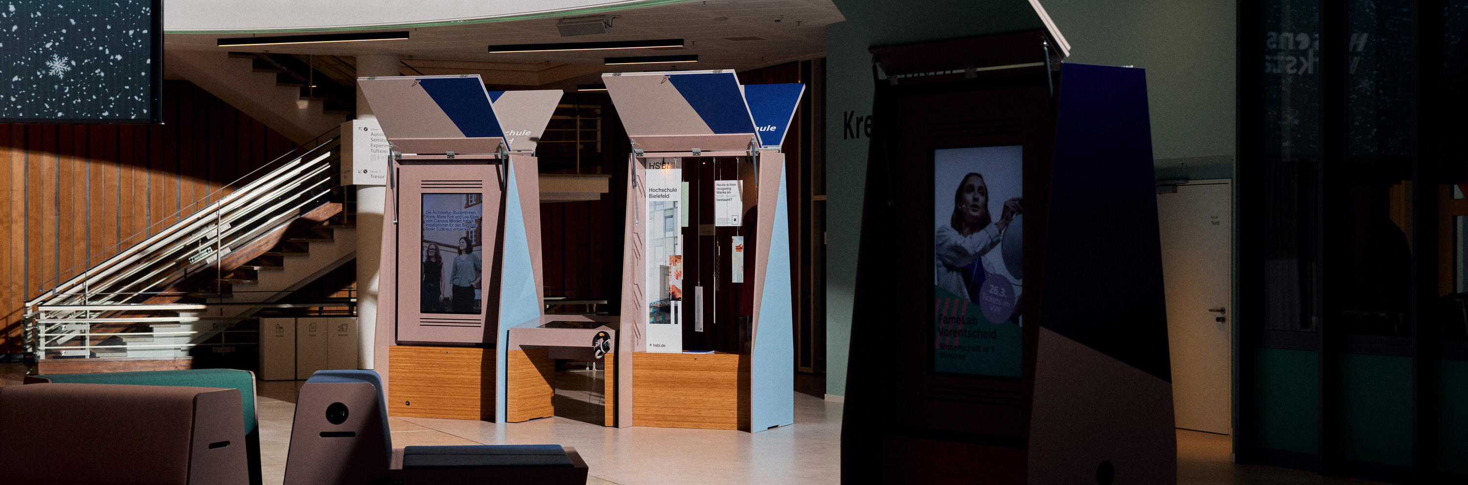 Wer die „Wissenswerkstadt“ über den Haupteingang an der Wilhelmstraße betritt, trifft als ersten Botschafter der HSBI auf den „Marktstand“ im „Oval“, dem zentralen Raum des Erdgeschosses. In diesem schrankähnlichen Modul können sich die Besucher:innen der „Wissenswerkstadt“ über zwei Bildschirme sowie Flyer und Jahresberichte über die Hochschule, Studienmöglichkeiten und Studiengänge informieren. Ein interaktiver Touchscreen richtet sich insbesondere an Studieninteressierte. Ein weiterer, großformatiger Vertikalbildschirm informiert in visuellen Kurzgeschichten über Neues aus der HSBI und bewirbt aktuelle Veranstaltungen.